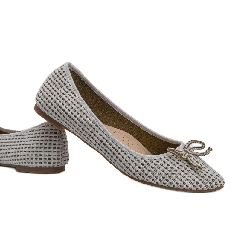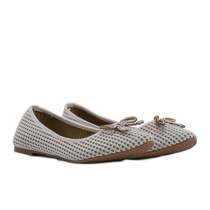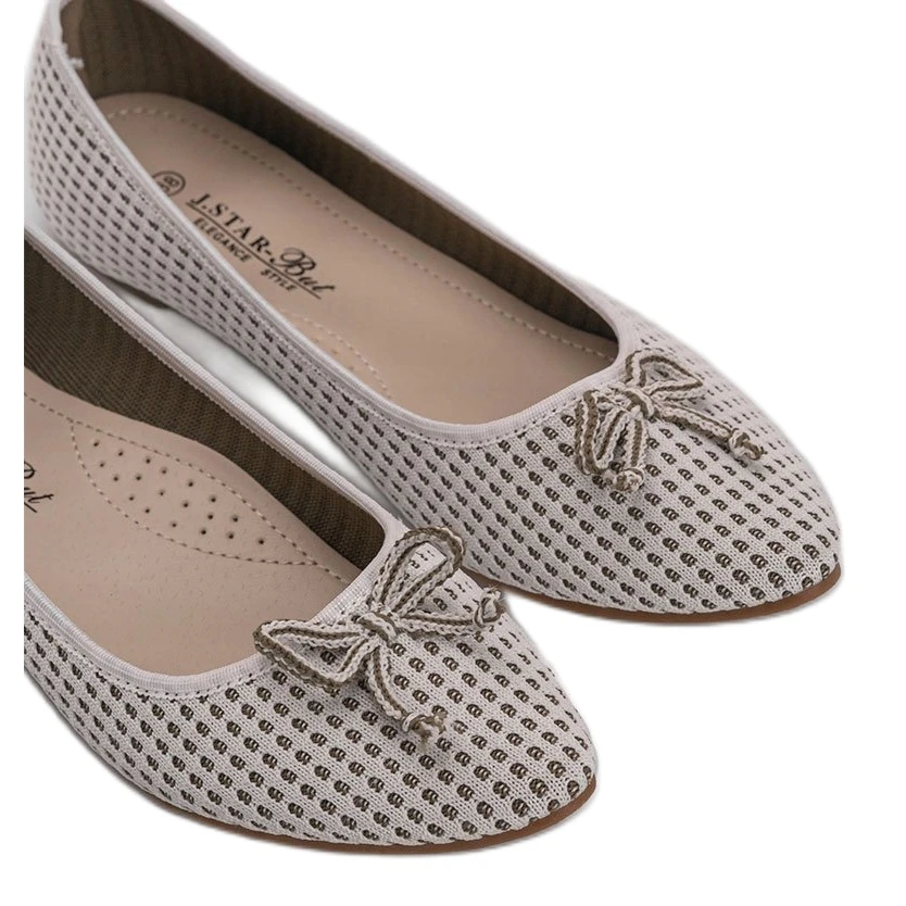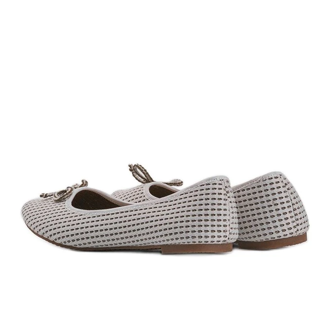 Les ballerines en tissu blanc et beige sont les chaussures parfaites pour la saison estivale à venir ! Les ballerines sont très légères, la matière est respirante, ce qui offre un grand confort à porter. Le bout est en forme d’amande, le haut des ballerines est orné d’un petit nœud en ficelle.
