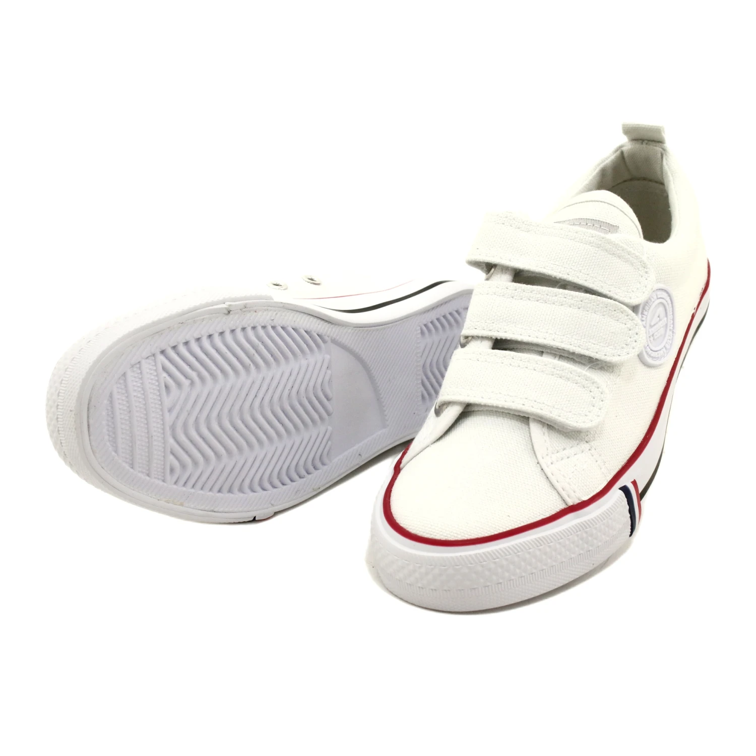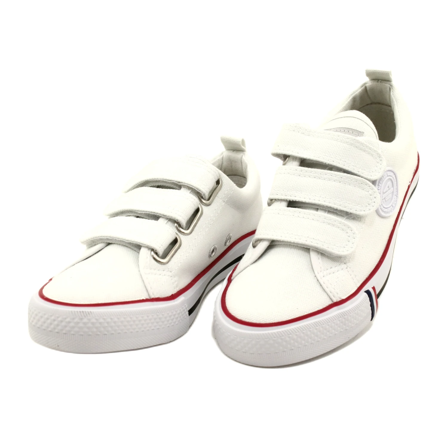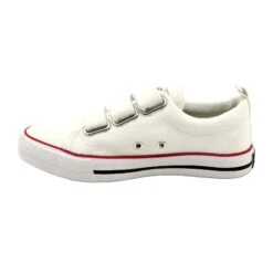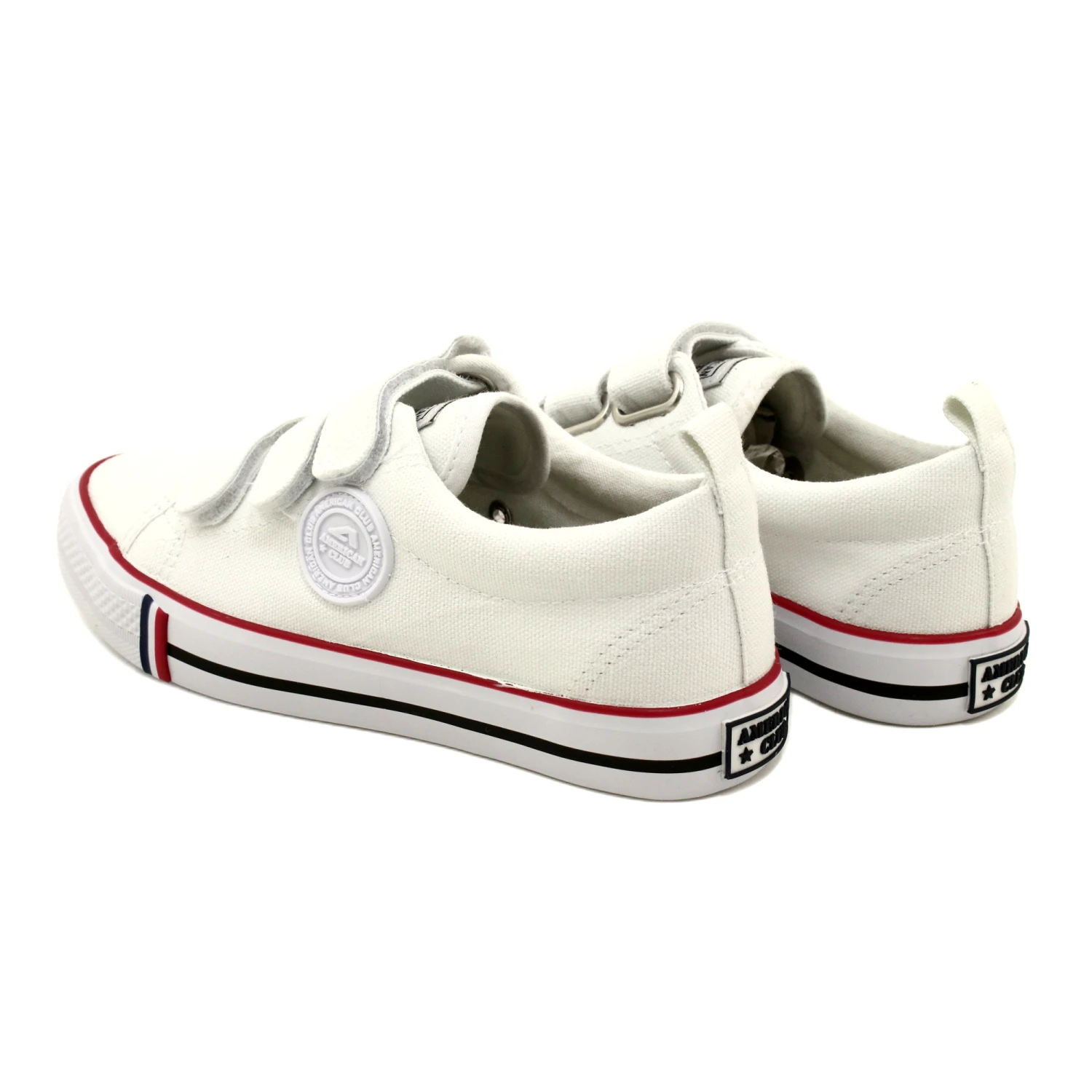 Charmantes baskets blanches avec une semelle blanche à trois fermetures velcro. Ce type de chaussures est surtout connu pour son confort exceptionnel. Chaussures en matière textile de haute qualité, l’intérieur de la chaussure est doublé de coton. La semelle est en caoutchouc souple qui ne limite pas les mouvements. Sa couleur blanche avec l’ajout d’une bande noire s’accorde parfaitement avec l’ensemble et est une sorte de contraste. La décoration est un badge rond contenant le logo du fabricant : American Club. Les baskets sont idéales pour la maternelle et l’école ou pendant les voyages du week-end et les jeux de l’après-midi dans la cour. Leur légèreté et leur confort ne poseront aucune limite.
