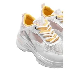Nous vous présentons des baskets à la mode en blanc. Les chaussures sont décorées d’inserts roses et holographiques caractéristiques. Les chaussures ont deux types de lacets, blanc et jaune. Numérotation standard, veuillez suivre votre taille.