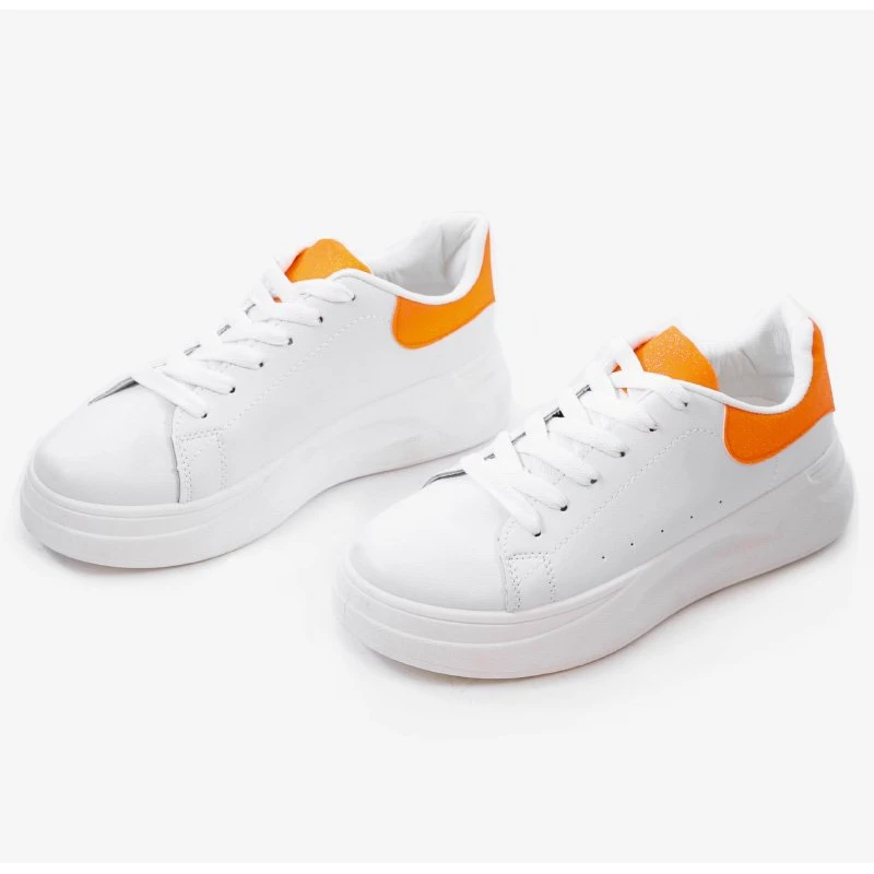 Baskets classiques délicates en blanc. Les chaussures sont décorées d’accessoires à paillettes orange sur la tige. La chaussure a une semelle solide.