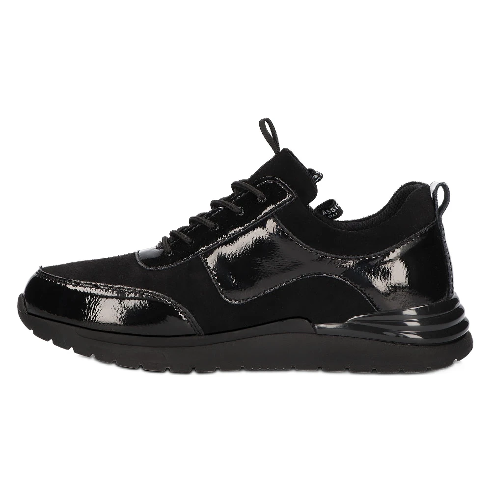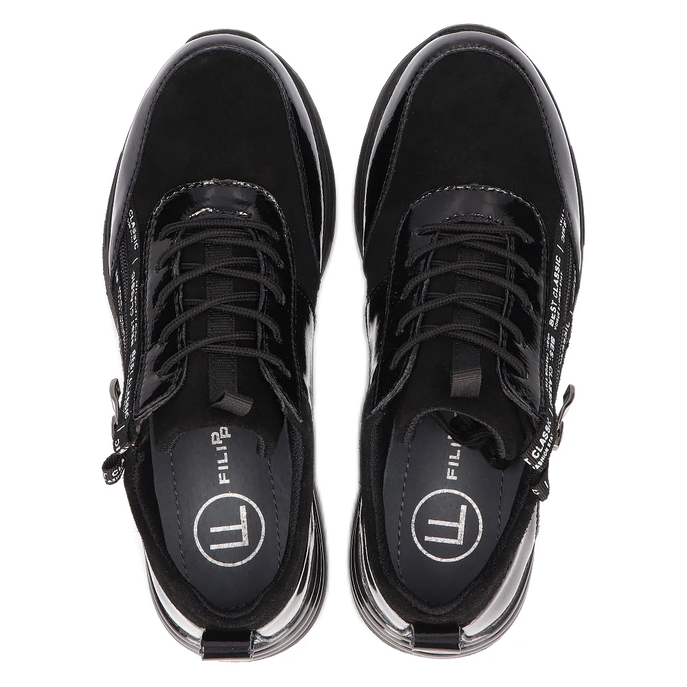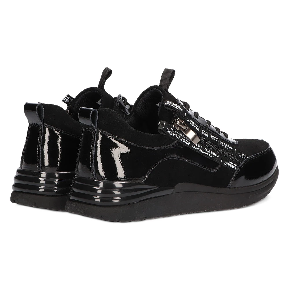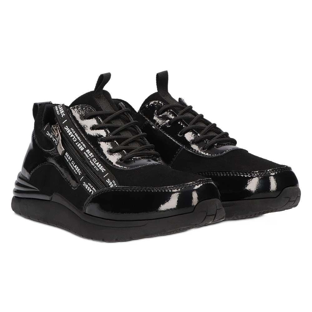 ExtrĂŞmement fĂ©minines, des chaussures de sport pour femmes sur une plateforme de 3,5 cm. FabriquĂ© en cuir naturel dans une belle couleur noire, une combinaison de vernis et de daim. ProfilĂ©es, avec une semelle intĂ©rieure en cuir, elles s’adaptent parfaitement au pied, et une bonne circulation d’air leur permet de respirer librement. La semelle est en thermo-caoutchouc avec une bande de roulement qui assure la stabilitĂ© de la marche mĂŞme sur des surfaces glissantes. LacĂ© classiquement et dotĂ© d’une fermeture Ă©clair supplĂ©mentaire, il s’associera parfaitement Ă l’ensemble avec une jupe.