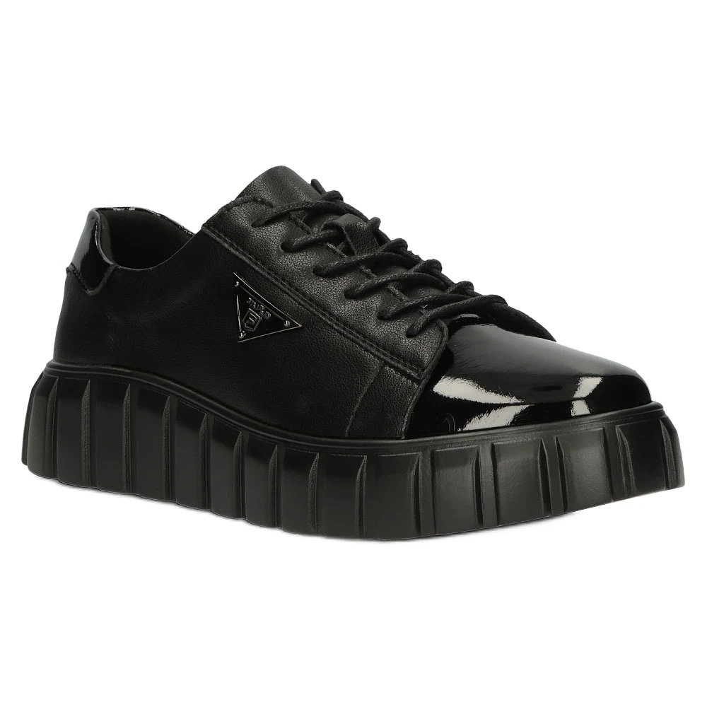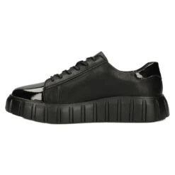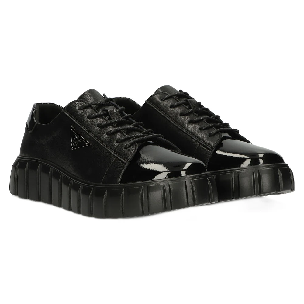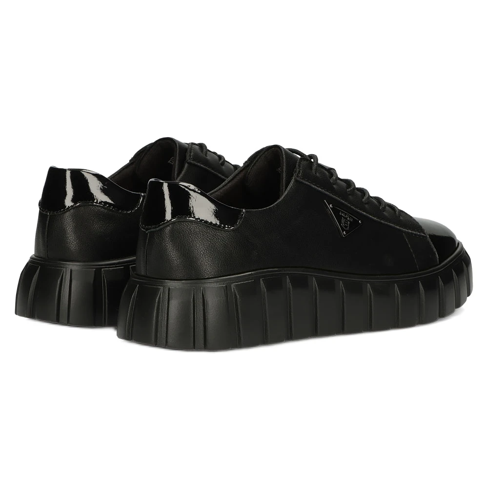 Chaussures de sport pour femmes extrêmement féminines sur une plateforme de 4 cm. Fabriqué en cuir naturel dans une belle couleur noire combinée avec du vernis. Profilés, avec une semelle intérieure en cuir, ils s’adaptent parfaitement au pied et une bonne circulation de l’air leur permet de respirer librement. La semelle est en caoutchouc thermo avec une bande de roulement qui offre flexibilité et stabilité à la marche. Classiquement lacé, il s’associera parfaitement à l’ensemble avec une jupe.