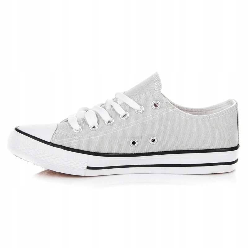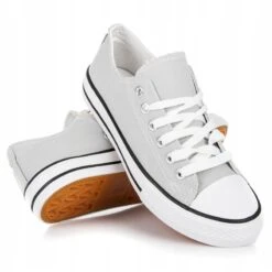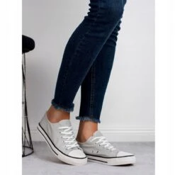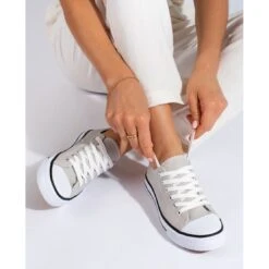 Les baskets grises sont des chaussures de sport pour femmes, adaptées à un usage quotidien à tout moment de l’année. Ces chaussures sont en matière textile, tandis que la semelle rechapée est en caoutchouc. Chaussures basses, plates, à lacets et bouts ronds, décorées dans des couleurs claires, grises et argentées.