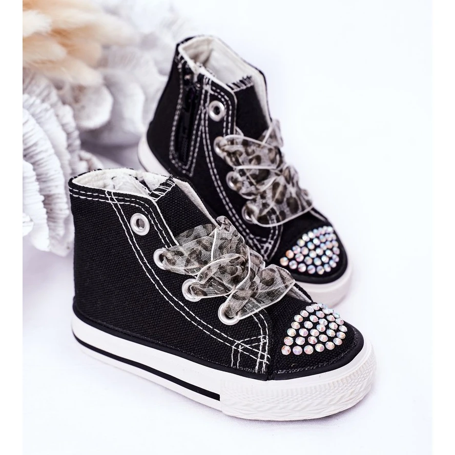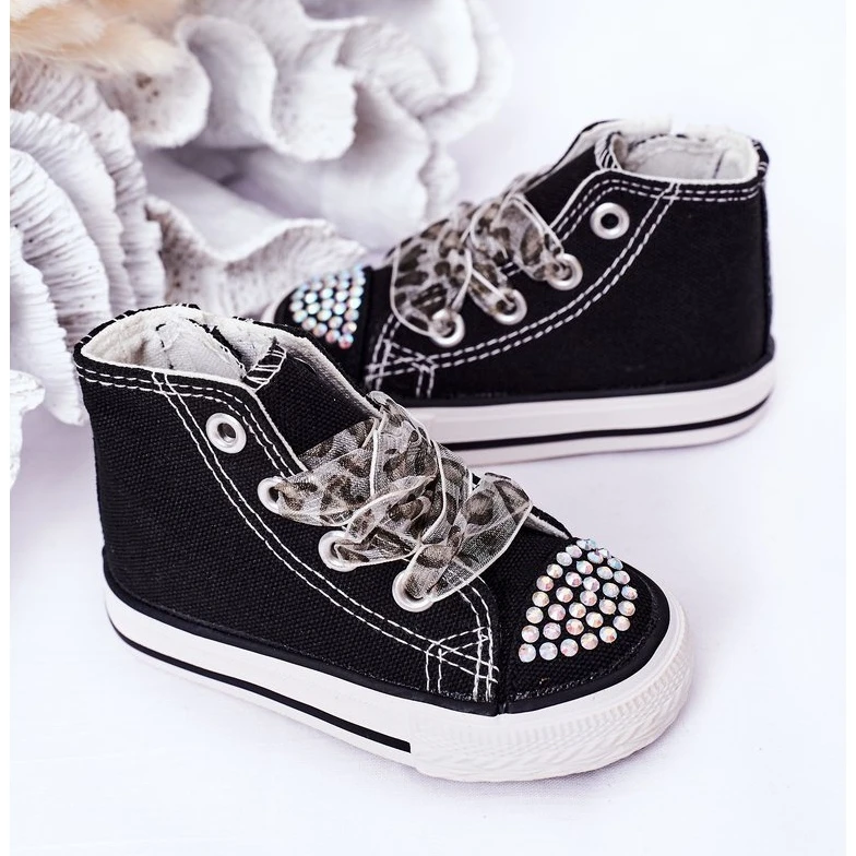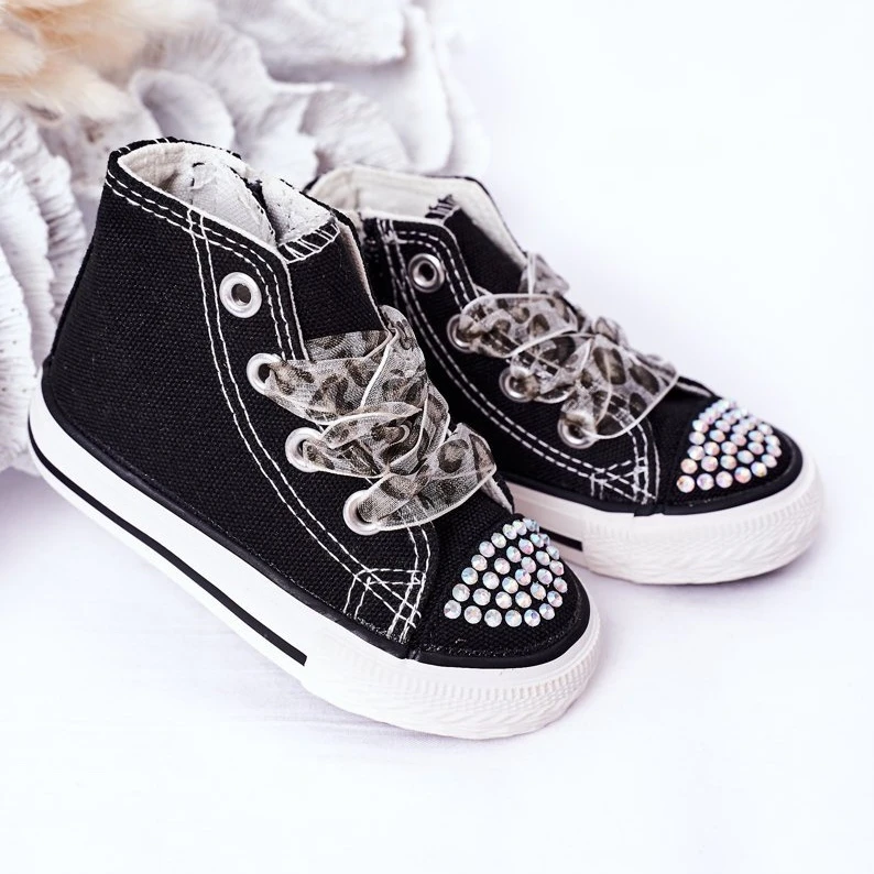 Baskets pour enfants en matière textile rĂ©sistante Ă la saletĂ©. Les chaussures ont une semelle antidĂ©rapante et une semelle intĂ©rieure en matĂ©riau souple. Il y a une fermeture Ă©clair Ă l’intĂ©rieur pour un enfilage facile. Lorsque vous choisissez une taille, veuillez utiliser le tableau des tailles. Les baskets ont deux types de lacets – noirs et colorĂ©s avec un imprimĂ© lĂ©opard.