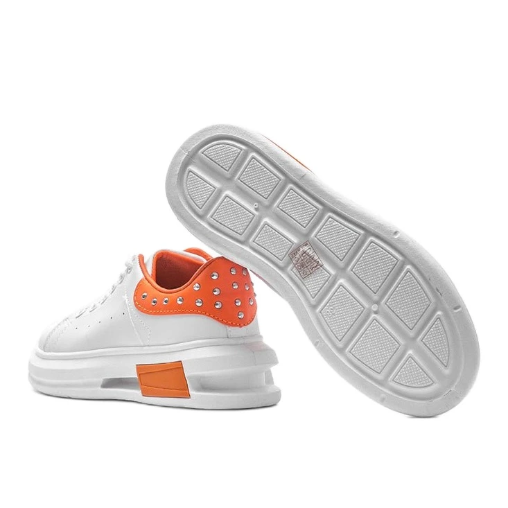Baskets blanches avec empiècements orange Ă l’arrière de la tige et de la semelle. Un accent intĂ©ressant sont les goujons dĂ©licats sur le dos. Les chaussures grâce Ă la semelle en forme de coin souligneront joliment la silhouette.