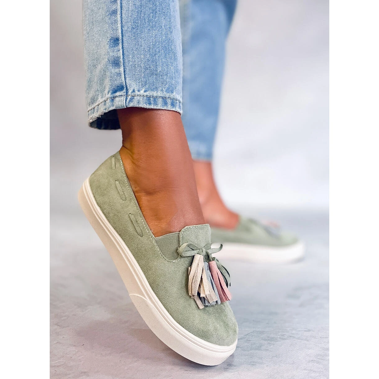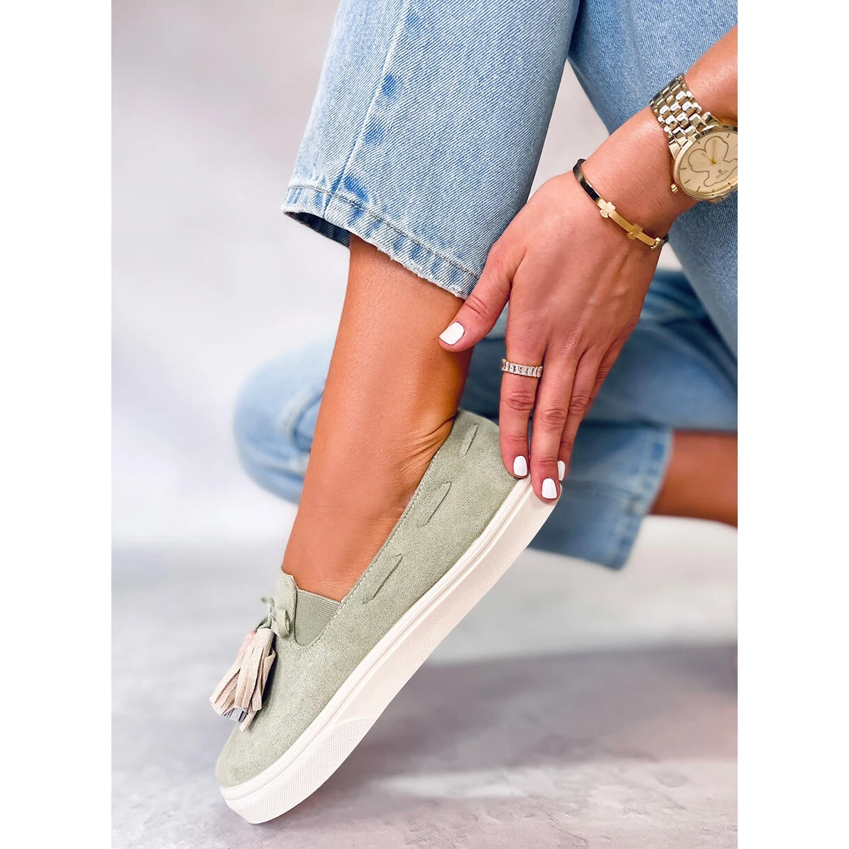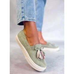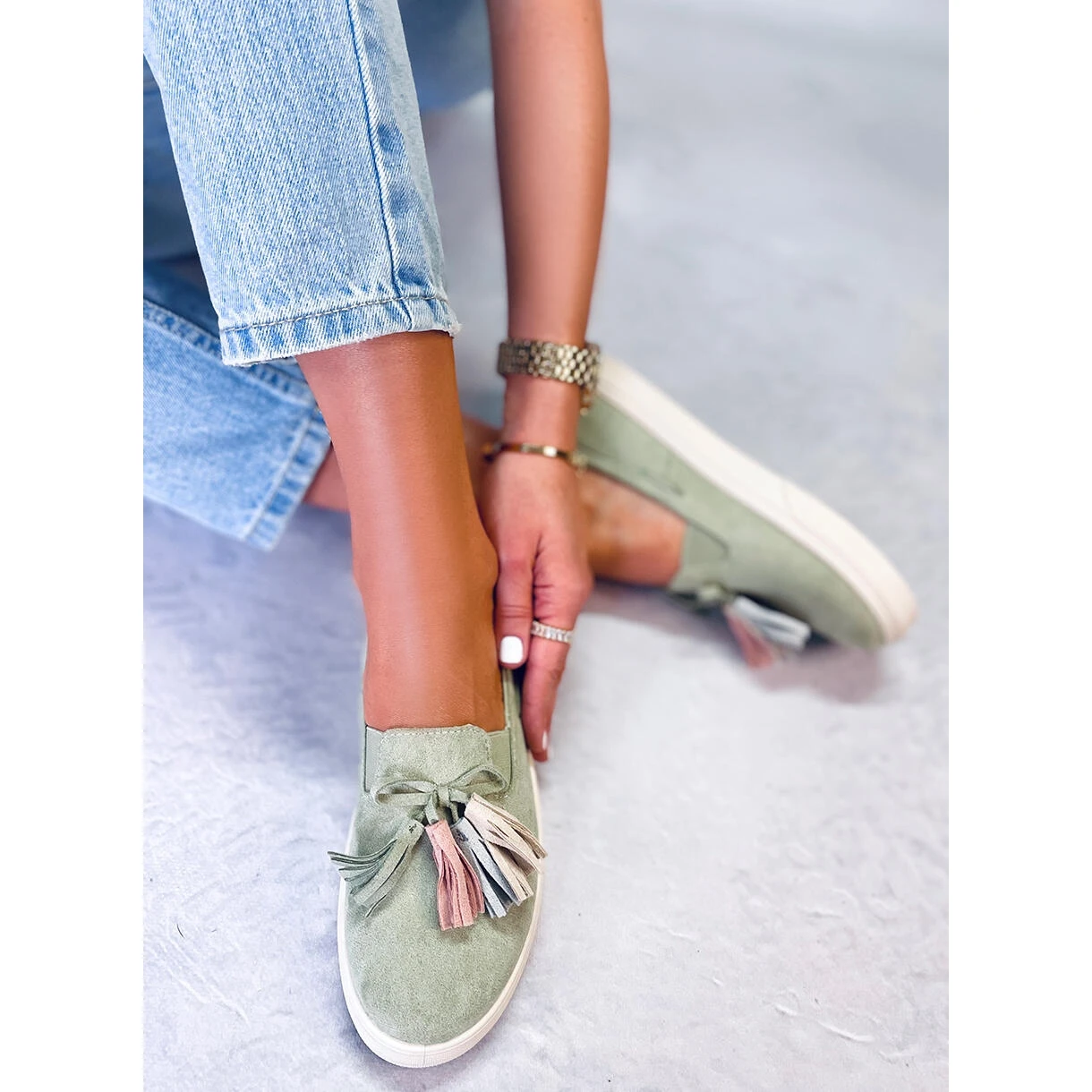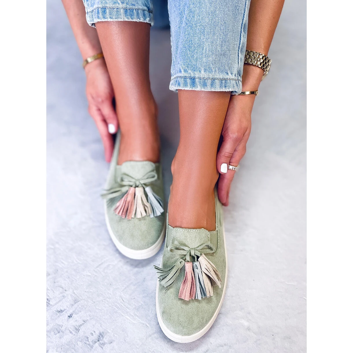 Baskets à enfiler printanières pour femmes. Si vous aimez le style bohème et que vous souhaitez attirer l’attention, choisissez ce modèle unique avec des pompons colorés. Non seulement ils ont fière allure, mais ils sont aussi super confortables ! Ils sont fabriqués en daim écologique et l’intérieur est doublé de tissu (blanc – cuir écologique).