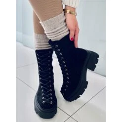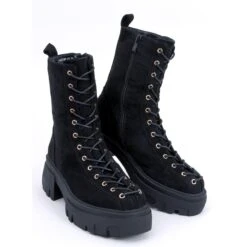 Bottes en daim pour femmes – bottes de travail à talons larges, hauteur 6 cm. Le modèle au laçage original attirera tous les regards ! C’est un must absolu 🙂 La fermeture éclair pratique facilitera son enfilage au quotidien. Ils sont faits de daim écologique et l’intérieur est doublé de fourrure délicate.