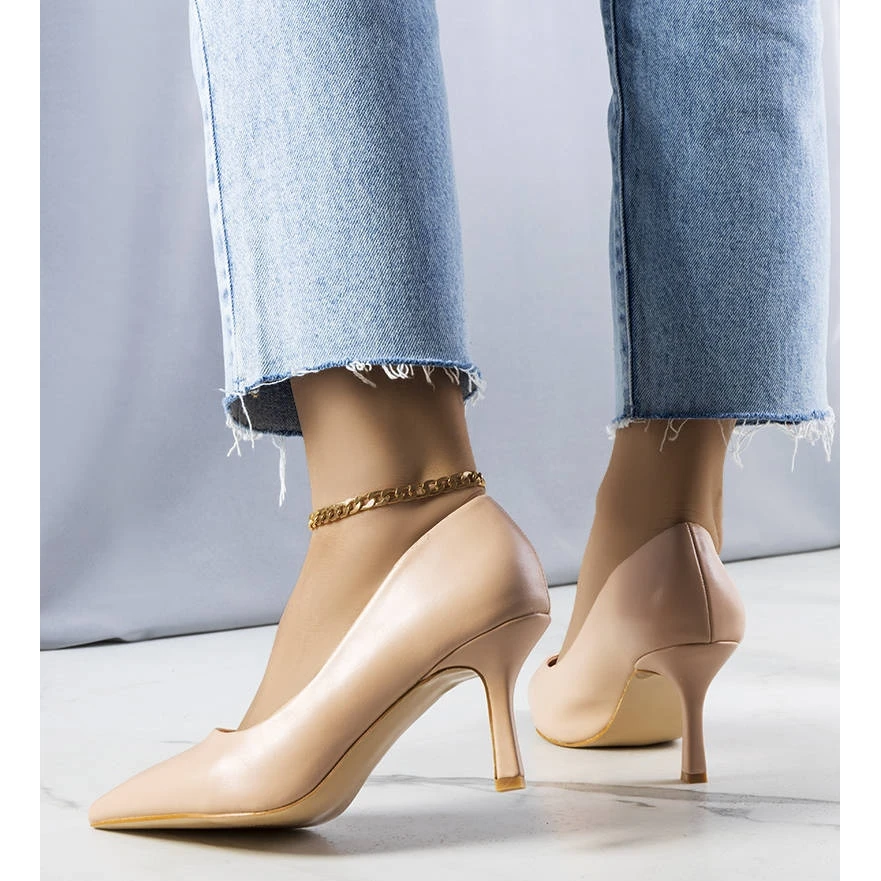 Escarpins Jayda à petit talon. Un modèle au bout pointu et fin. Fabriqué en cuir écologique mat, talon enduit, semelle intérieure en cuir écologique. Les talons de style glamour s’accorderont parfaitement avec les robes de cocktail. Ils s’adaptent bien sur un pied étroit. Numérotation standard, veuillez vous référer à votre taille.