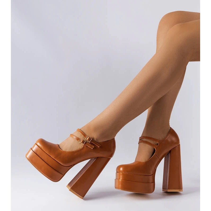Pompes Chouinard avec un bloc haut revêtu et une plate-forme supplémentaire. Nez carré arrondi. Fermeture par fines lanières à petites boucles. Fabriqué en cuir écologique. Le tout dans une seule couleur. C’est un modèle qui allongera parfaitement vos jambes. Numérotation standard, veuillez vous référer à votre taille.