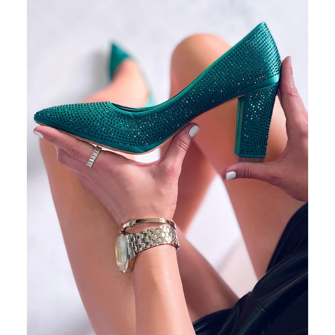 Escarpins féminins formels sur le poteau. Serti de pierres scintillantes, le modèle attirera tous les regards ! Shine and you 🙂 Les chaussures ont une coupe soignée et très féminine avec des orteils fuselés, ainsi qu’un talon stable de 8,5 cm, qui vous assurera un confort à chaque pas. Ils sont faits de tissu satiné, ce qui souligne leur style unique…