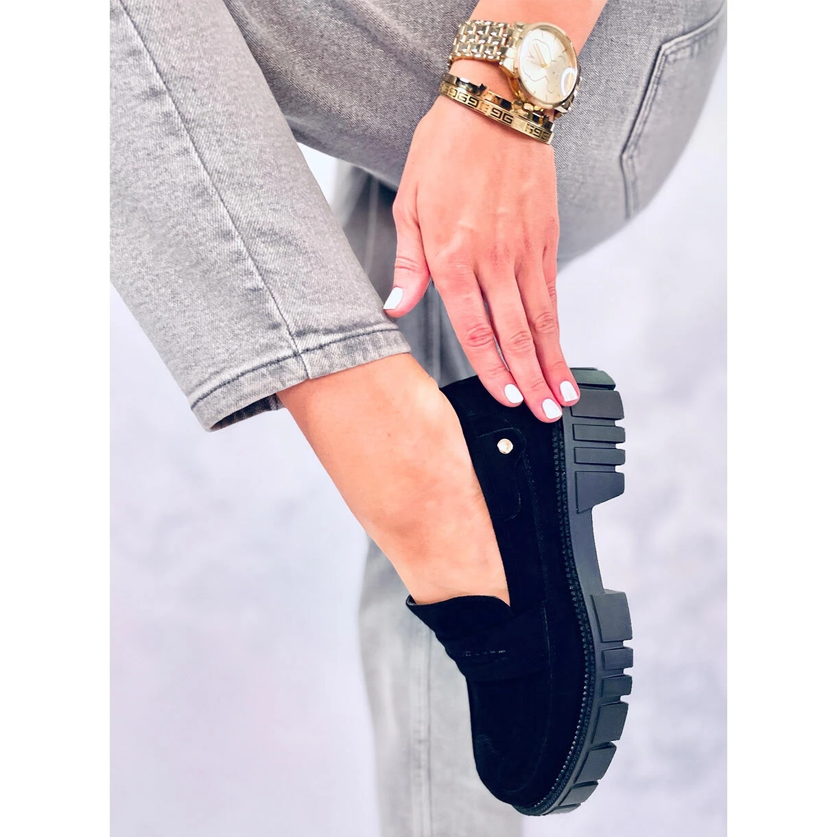 Mocassins en daim pour femme sur la plateforme. Le modèle se distingue par la coupe la plus en vogue sur une semelle massive de 2,5 cm. Savez-vous quelles chaussures domineront votre garde-robe ? : ) Ils sont fabriqués en daim écologique, ce qui souligne leur style unique…