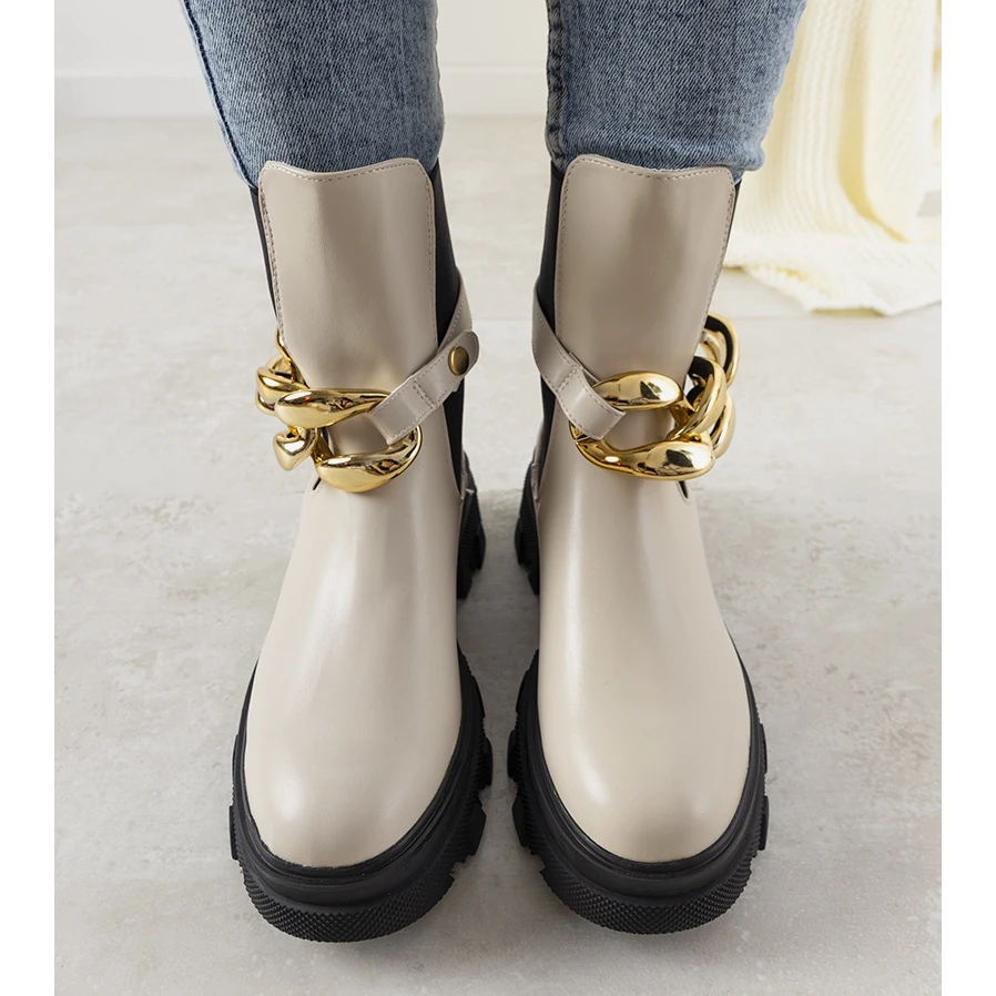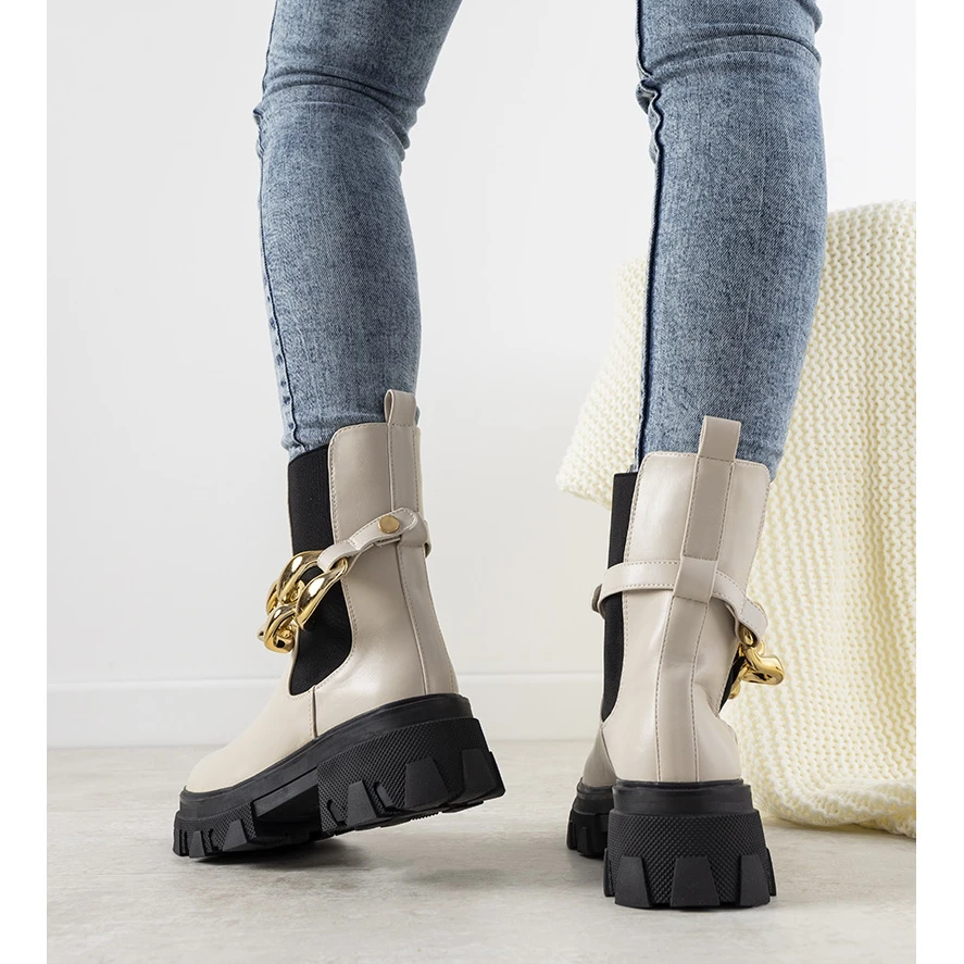 Attention les bottes sont impressionnantes. Les chaussures sont en cuir écologique. Ils sont ornés d’une chaîne dorée sur la ceinture. La semelle trappeur haute est un hit de cette saison ! Les chaussures sont à enfiler, ont des inserts élastiques sur les côtés de la tige qui facilitent l’enfilage et offrent un meilleur ajustement. La chaîne est amovible. Numérotation normale. veuillez suivre votre taille.