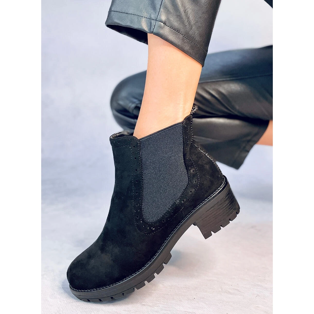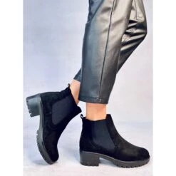 Bottines femme en daim – Chelsea boots sur le protecteur. Ce modèle unique se distingue par une finition subtile de la tige créant un motif unique… Les bottines Chelsea sont des chaussures parfaites au quotidien ! Le confort d’enfilage est assuré par des inserts élastiques sur les côtés de la tige. Ils sont en daim écologique et l’intérieur est doublé de fourrure délicate.