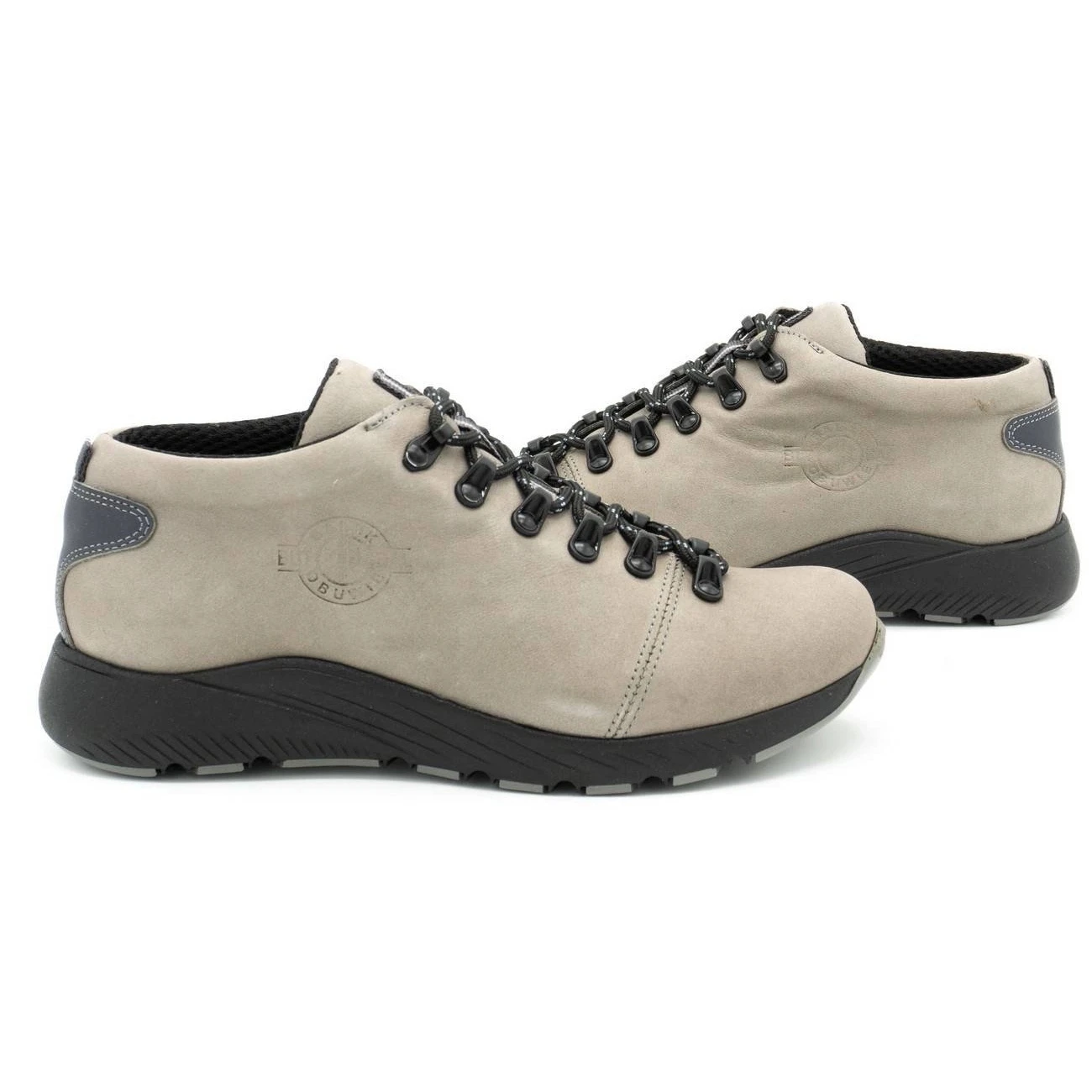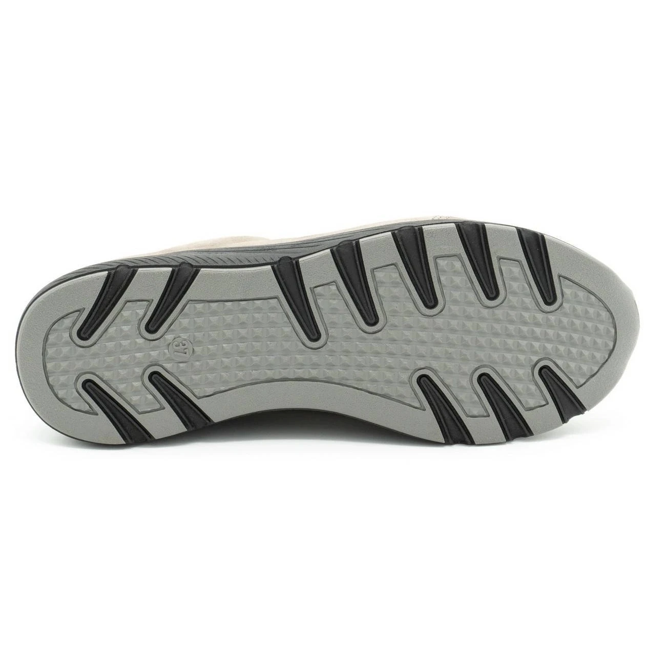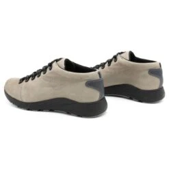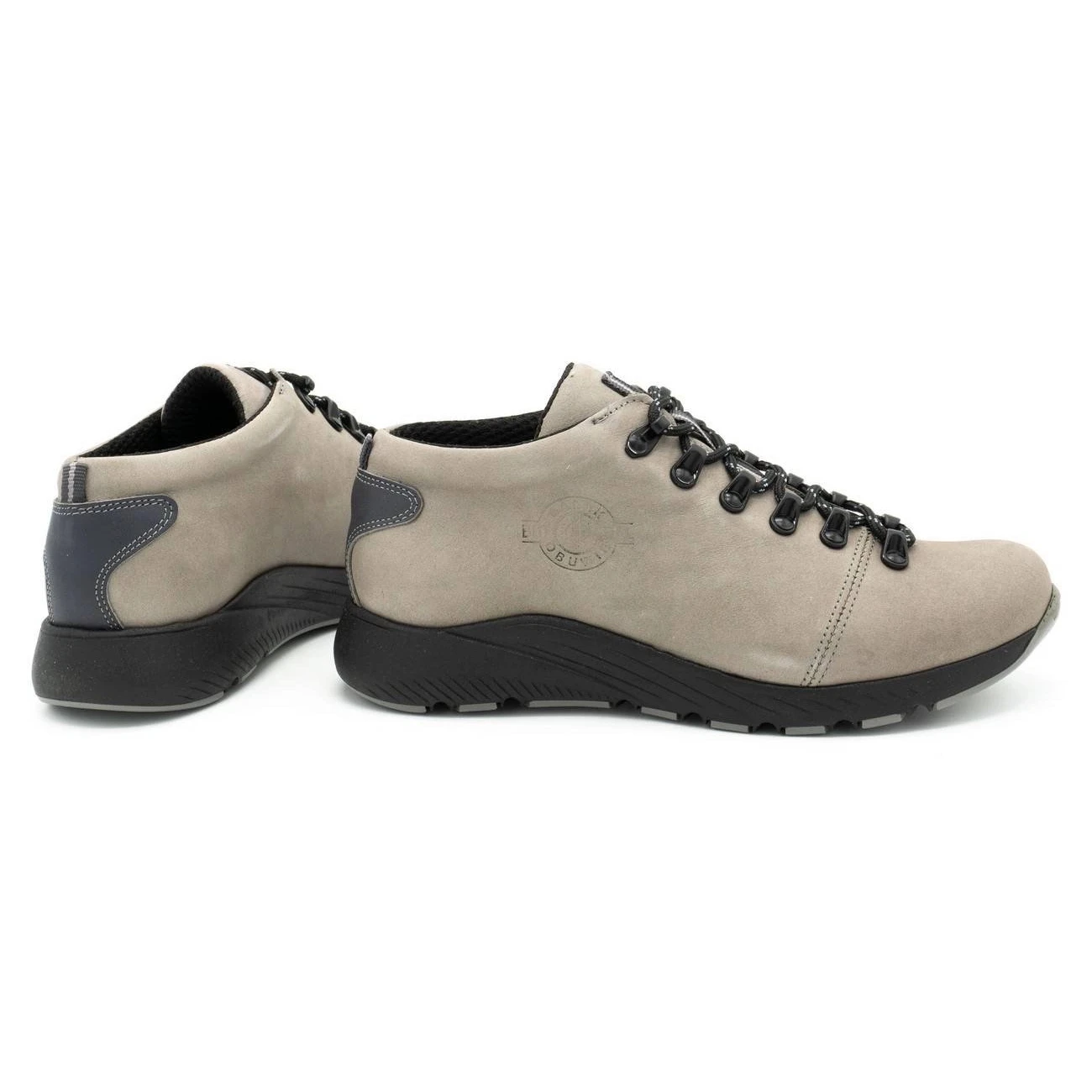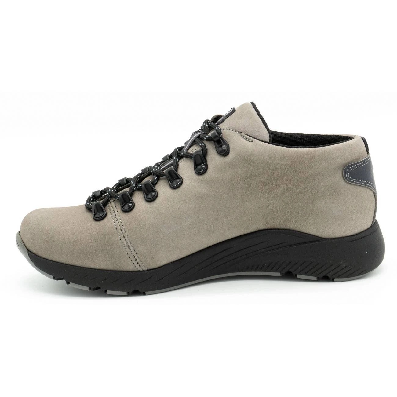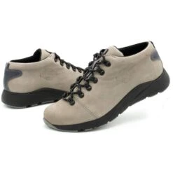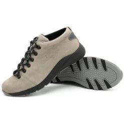 Chaussures de trekking décontractées pour femmes en cuir naturel de haute qualité. Les chaussures grises ont des lacets foncés à l’arrière dans de grandes boucles métalliques. Les orteils classiquement arrondis sont légèrement surélevés et renforcés aux extrémités. La plate-forme noire de 3 cm a une semelle à bande de roulement synthétique en bas.