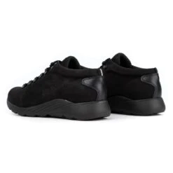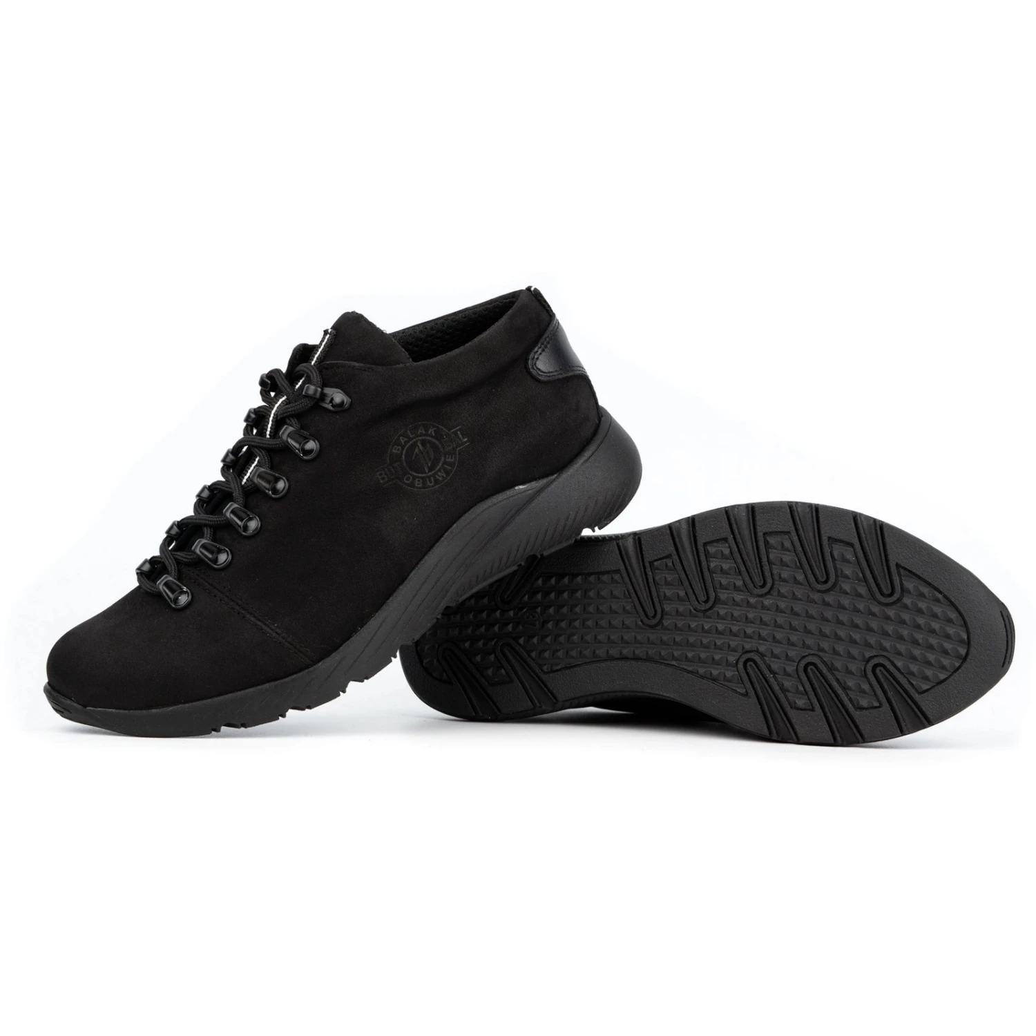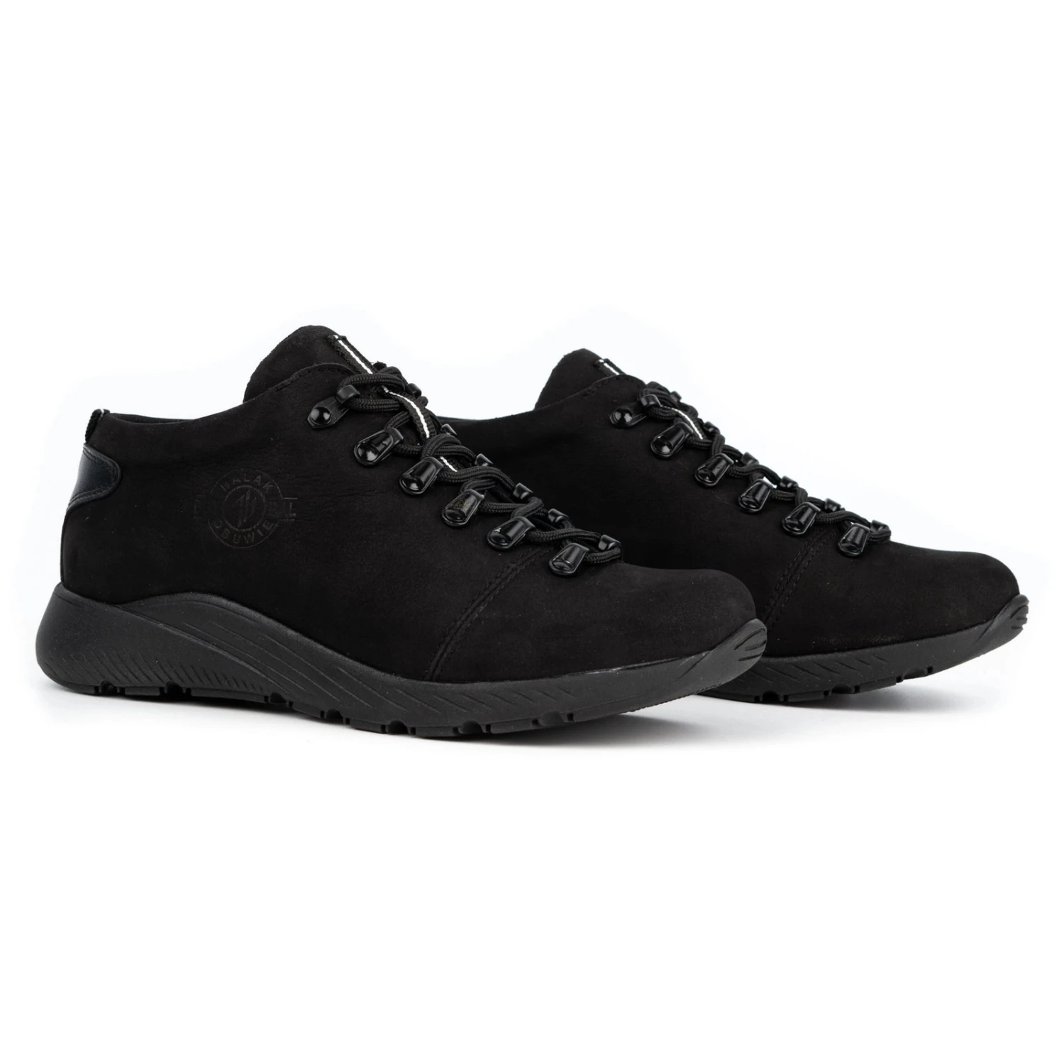 Chaussures de trekking pour les femmes qui apprécient le confort et la haute qualité. Les chaussures de sport en cuir naturel sont doublées de textile à l’intérieur. Les chaussures noires à l’arrière ont une languette sur laquelle se trouvent les lacets. La partie inférieure est une plate-forme en plastique avec une semelle rechapée.