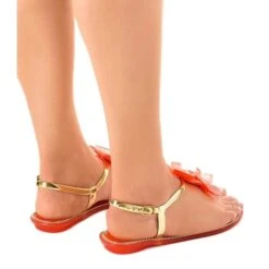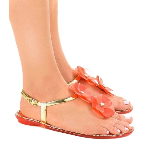 Les tongs dorées et rouges décorées de fleurs sont à la fois extrêmement à la mode et modernes. Ils ont fière allure avec un short ou un jean.