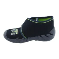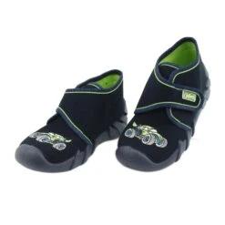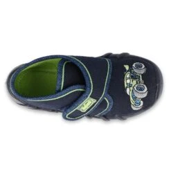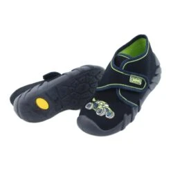 Chaussons pour enfants confortables et adaptĂ©s aux enfants. Leur tige est entièrement rĂ©alisĂ©e dans une matière textile bleu marine soigneusement sĂ©lectionnĂ©e. Les chaussures sont fixĂ©es avec du velcro situĂ© sur le poignet du pied. Ă€ l’avant, les embouts sont lĂ©gèrement arrondis et au-dessus d’eux se trouve un ornement de voiture.