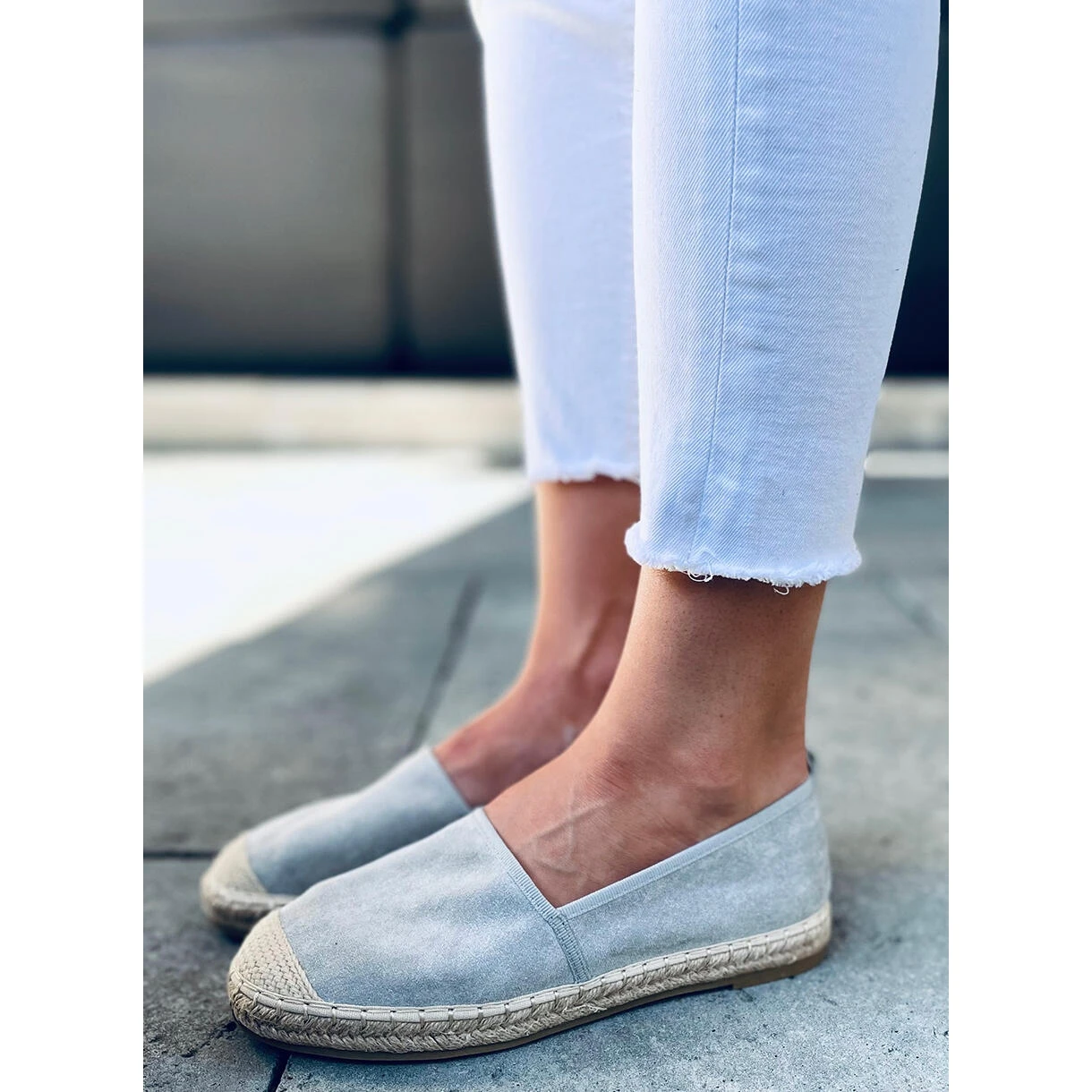 Espadrilles femme sur semelle plate. Ce sont les chaussures parfaites pour les fans de solutions Ă la mode qui fonctionnent dans toutes les situations ! Leur design classique est soulignĂ© par une finition magnifiquement chatoyante qui leur donne un caractĂšre unique. Ils sont fabriquĂ©s en daim Ă©cologique et l’intĂ©rieur est doublĂ© de tissu.