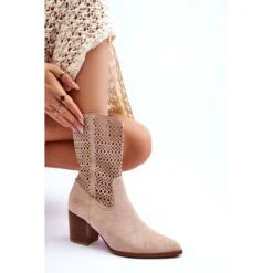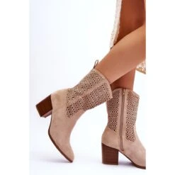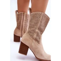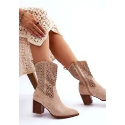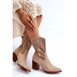 Bottes de cow-boy Ă la mode avec une tige plus haute. Ils sont fabriquĂ©s en daim Ă©cologique avec un motif ajourĂ© Ă la mode. L’insert de matière et le contrefort de talon rigidifiĂ© assureront votre confort. Ils ont un talon massif en forme de poteau. Parfait pour les robes et les jeans. Lorsque vous choisissez une taille, veuillez utiliser le tableau des tailles.