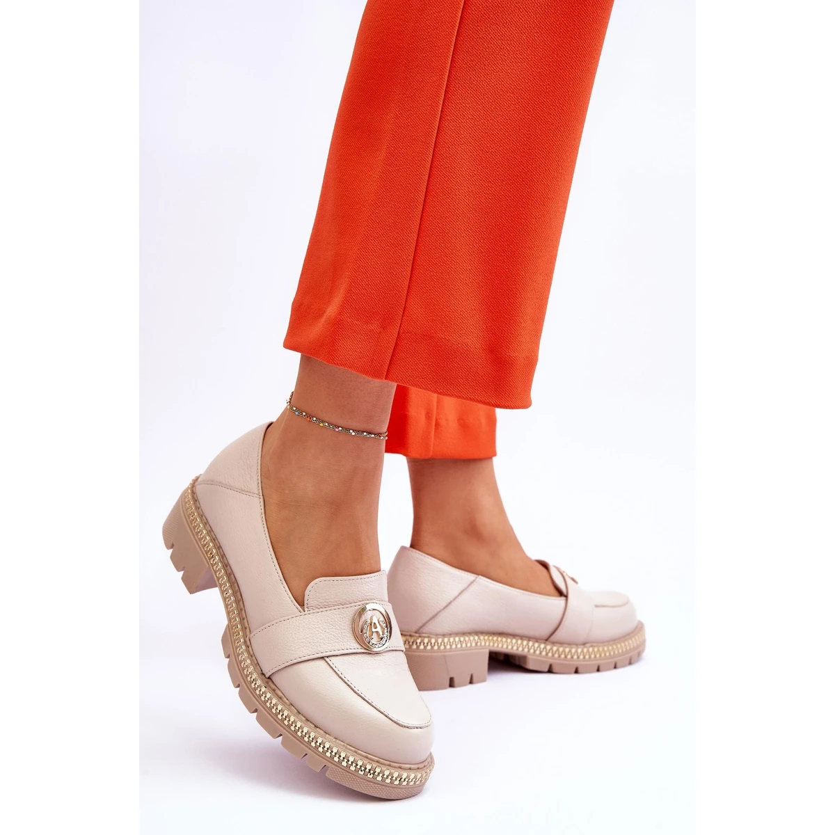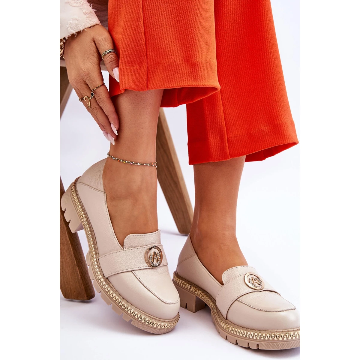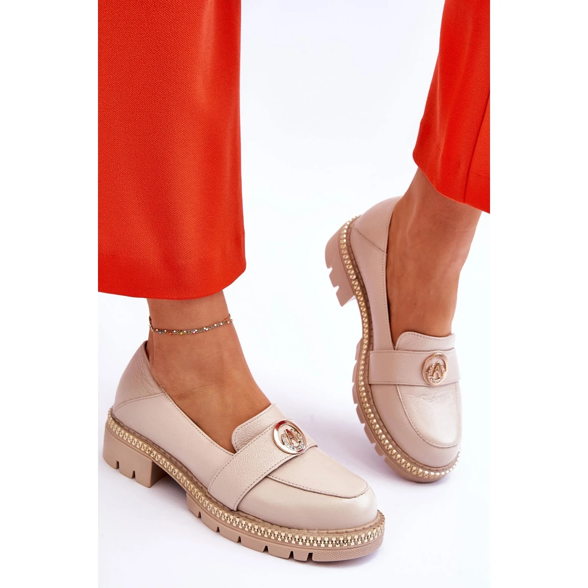 Mocassins femme uniques montés sur un talon plat et une plateforme ornée d’une fermeture éclair. Le modèle est en cuir naturel. De plus, elles ont une décoration avec des jets sur la sangle et un contrefort de talon rigidifié. La semelle intérieure en cuir souple assure une utilisation confortable. Les mocassins auront fière allure dans de nombreux styles! Lorsque vous choisissez une taille, veuillez utiliser le tableau des tailles.