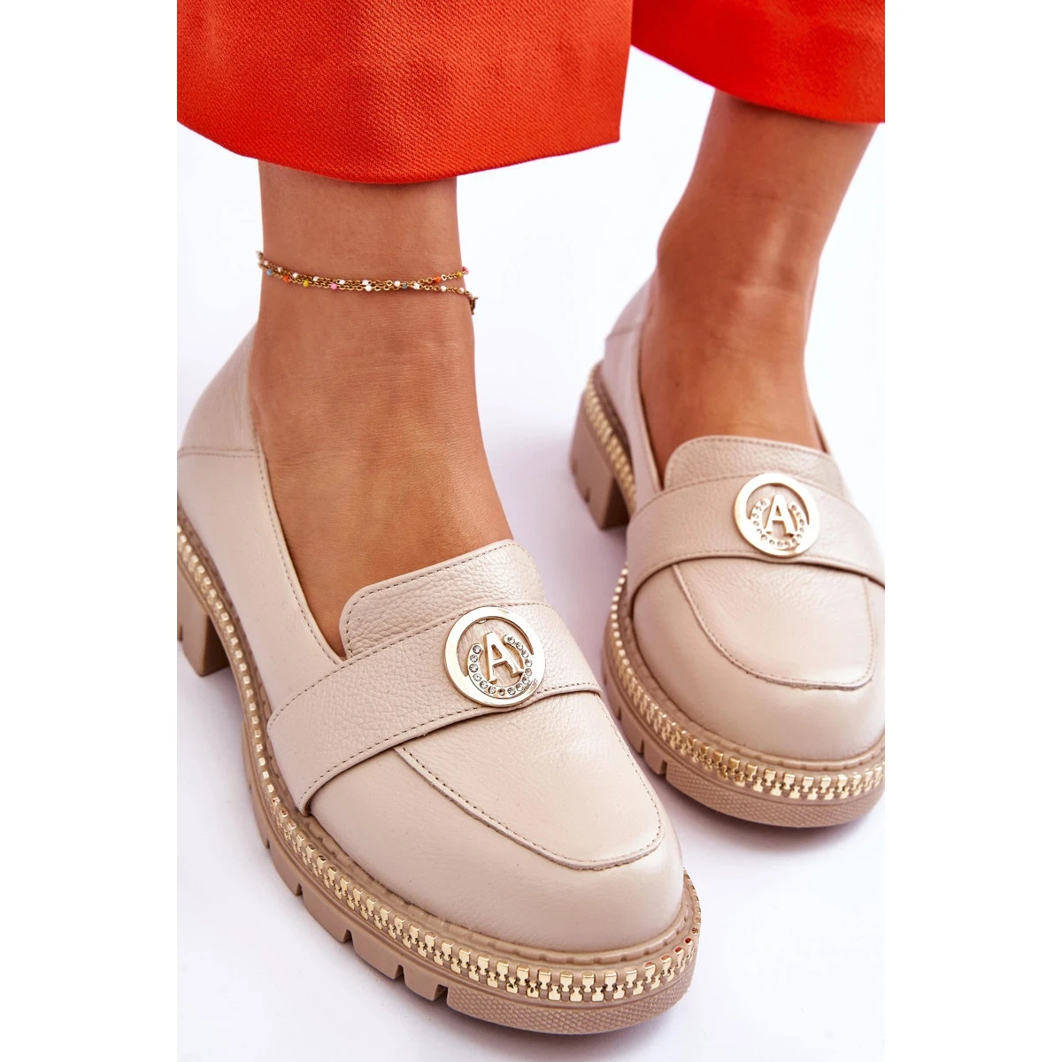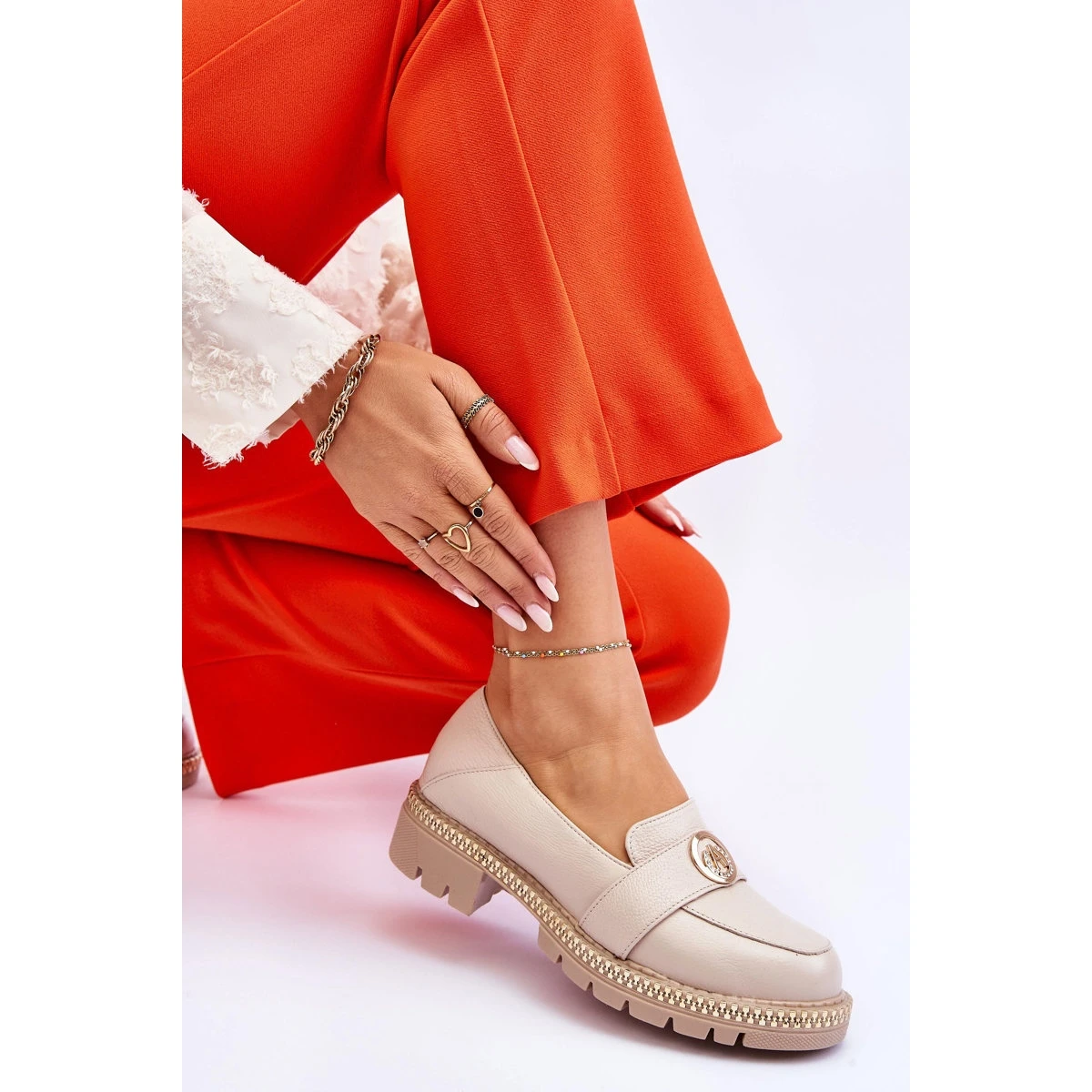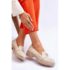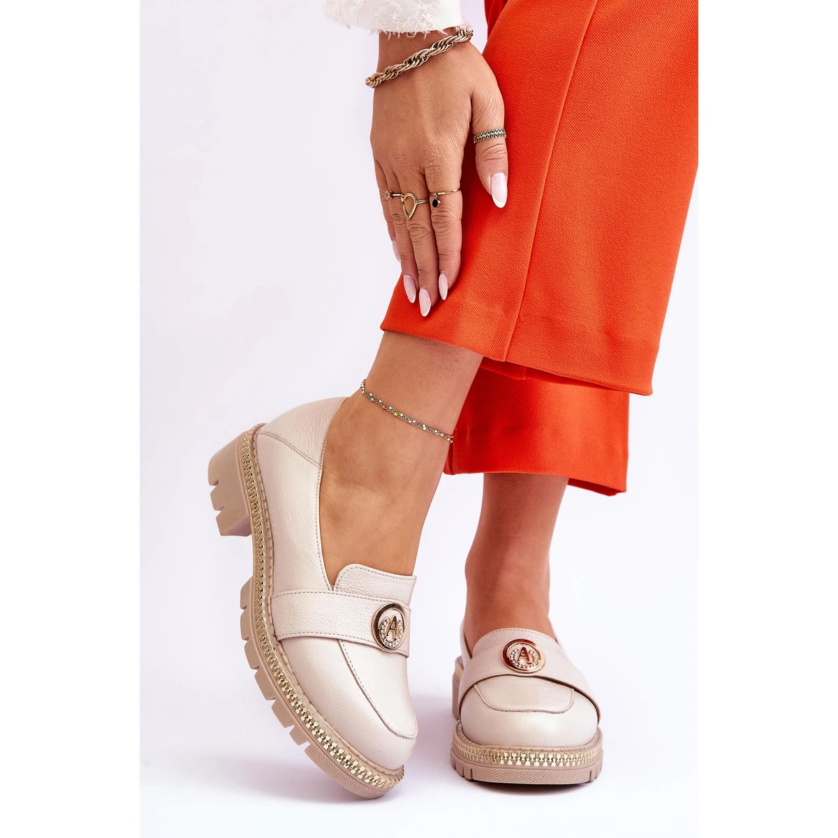 Mocassins femme uniques montés sur un talon plat et une plateforme ornée d’une fermeture éclair. Le modèle est en cuir naturel. De plus, elles ont une décoration avec des jets sur la sangle et un contrefort de talon rigidifié. La semelle intérieure en cuir souple assure une utilisation confortable. Les mocassins auront fière allure dans de nombreux styles! Lorsque vous choisissez une taille, veuillez utiliser le tableau des tailles.