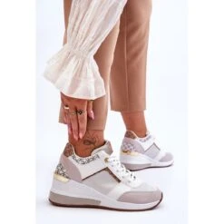 Les baskets sont en cuir écologique. Ce modèle était monté sur une cale avec un élément miroir et une plate-forme. Les chaussures ont un laçage classique et un contrefort de talon légèrement renforcé. Ce modèle confortable est parfait pour un style quotidien. Vous devriez absolument les avoir! Lorsque vous choisissez une taille, veuillez utiliser le tableau des tailles.