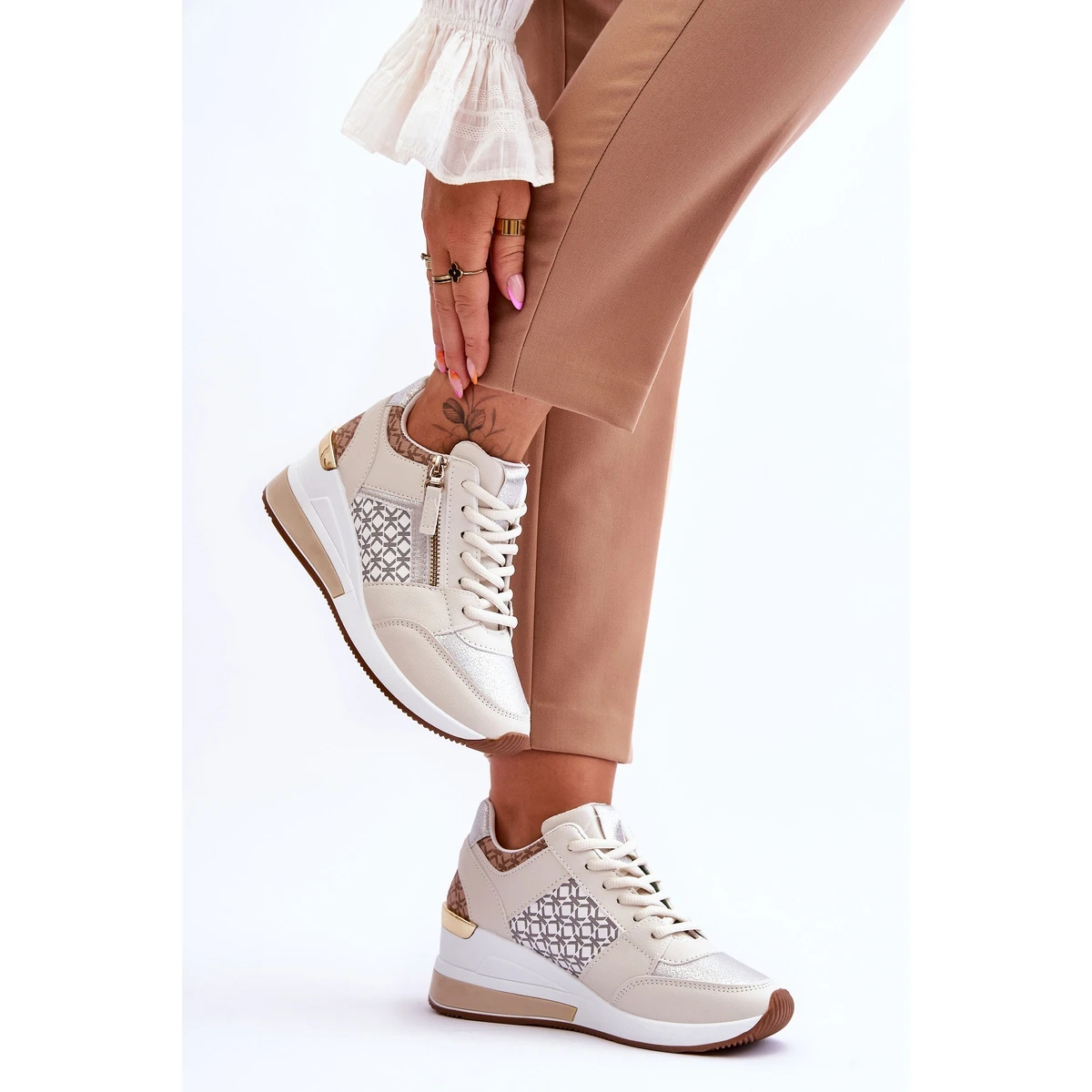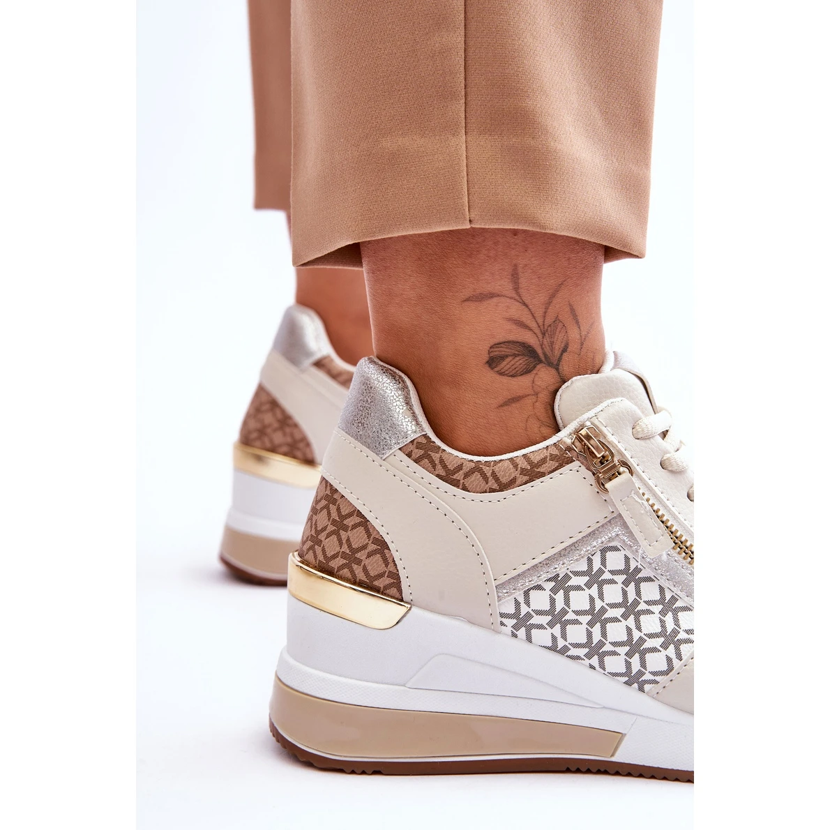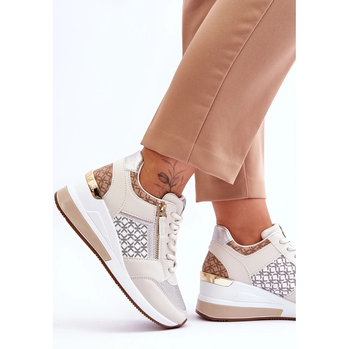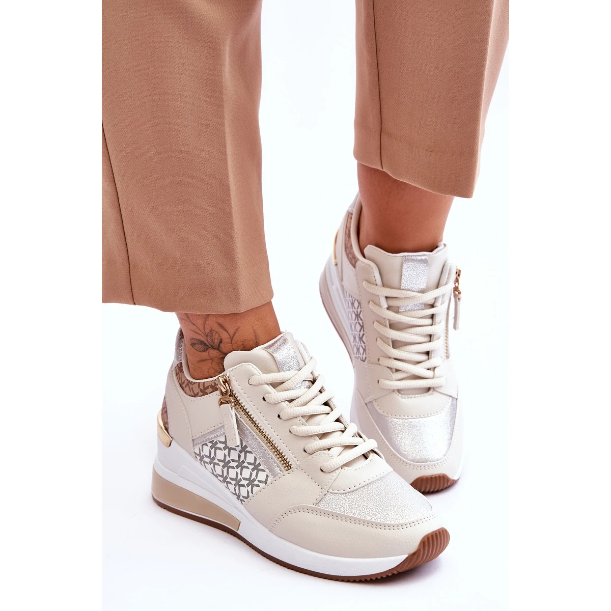 À la mode, les chaussures de sport pour femmes sont fabriquées en cuir écologique. Elles ont un élément miroir au talon et une fermeture éclair décorative et amovible. Ce modèle était monté sur une cale avec une plate-forme. Les chaussures ont un laçage classique. La semelle intérieure souple de ces chaussures est en tissu. Le contrefort de talon de ces chaussures est légèrement renforcé. Lorsque vous choisissez une taille, veuillez utiliser le tableau des tailles.