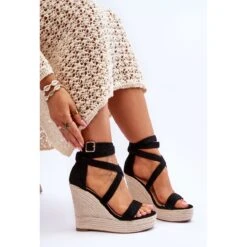 Sandales confortables avec semelle compensée et plateforme tressée. Ce modèle se ferme à l’aide d’une sangle réglable avec boucle. Les sandales sont en daim écologique. Ils ont une semelle en plastique. Ce modèle unique enrichira à coup sûr votre dressing d’été ! Les sandales sont parfaites pour les robes aérées. Ils seront parfaits lors des journées chaudes.Lorsque vous choisissez une taille, veuillez utiliser le tableau des tailles.