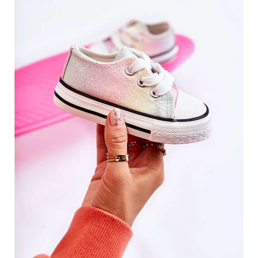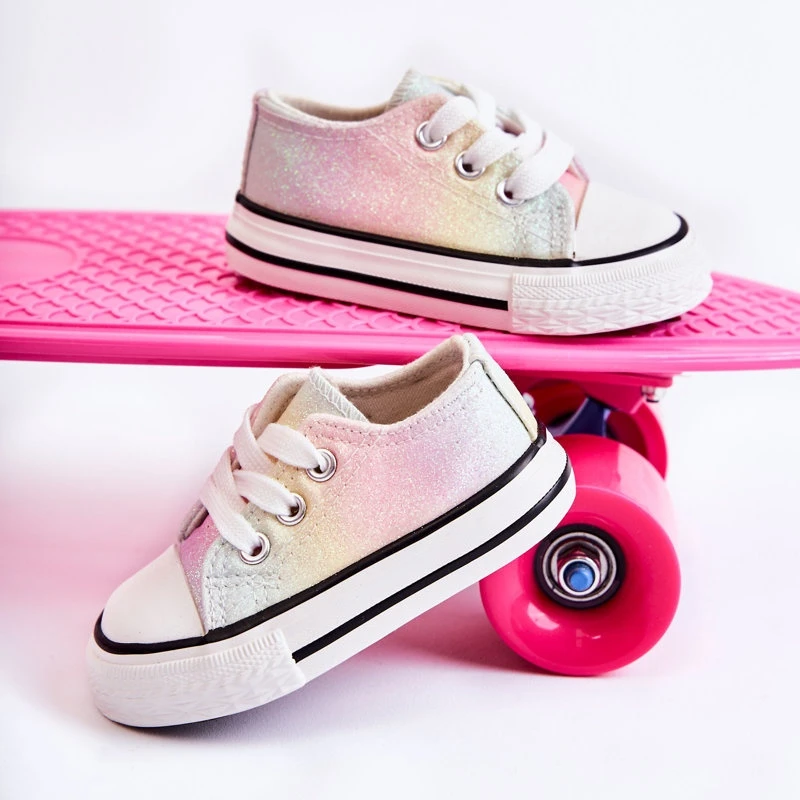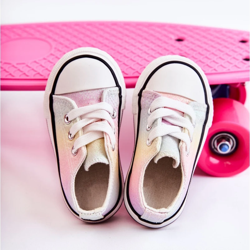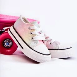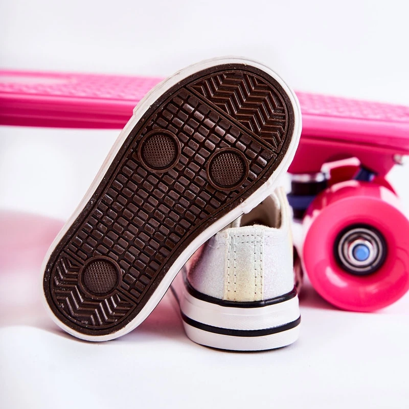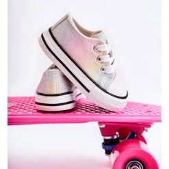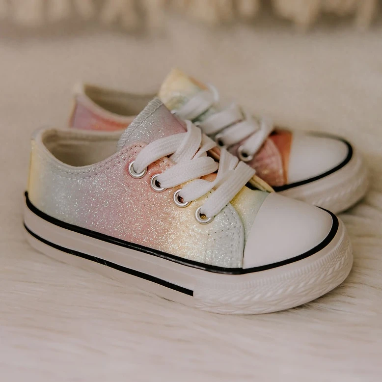 Baskets pour enfants en matière textile. Décoré de paillettes. Reliure classique. Pointe renforcée avec du caoutchouc. Semelle intérieure souple et textile. Semelle en caoutchouc et antidérapante. Baskets légères et confortables. Parfait pour le printemps et l’été. Lorsque vous choisissez une taille, veuillez utiliser le tableau des tailles.