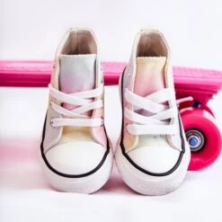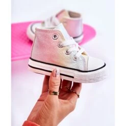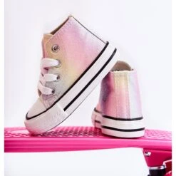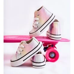 Baskets montantes pour enfants en matière textile. Décoré de paillettes. Reliure classique. Pointe renforcée avec du caoutchouc. Semelle intérieure souple et textile. Semelle en caoutchouc et antidérapante. Baskets légères et confortables. Parfait pour le printemps et l’été. Lorsque vous choisissez une taille, veuillez utiliser le tableau des tailles.