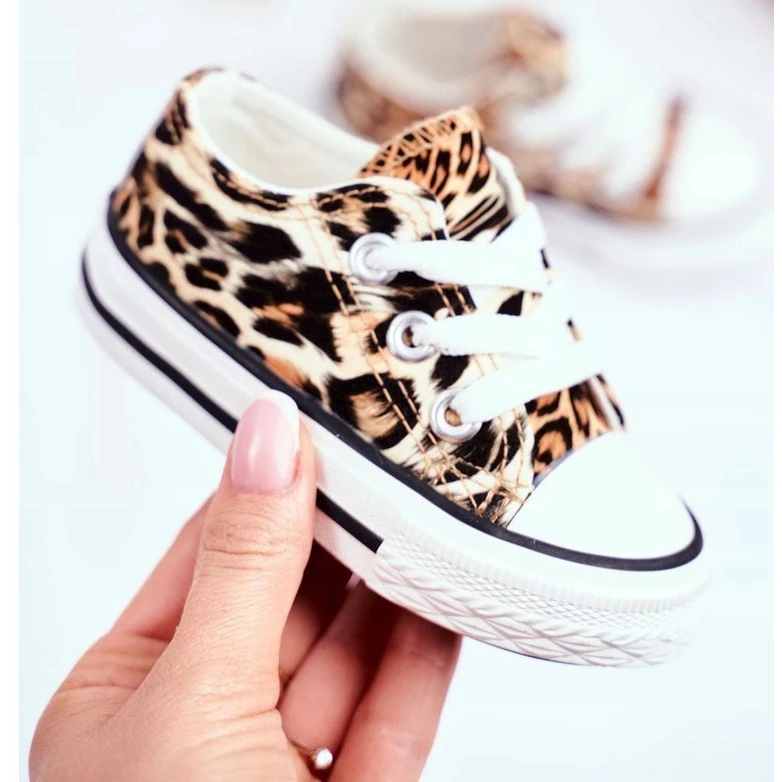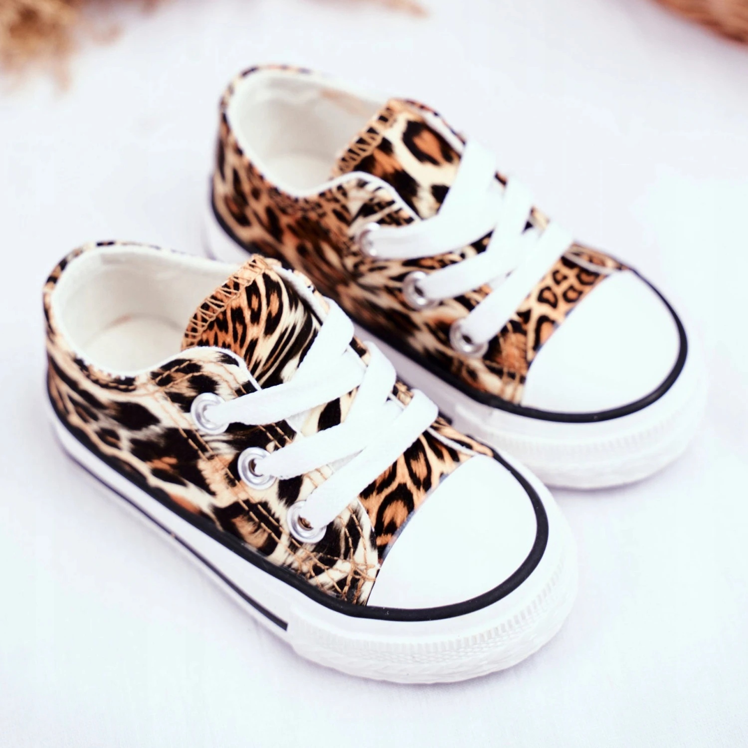 Baskets classiques en matière brillante. Les chaussures ont un motif léopard à la mode et brillent magnifiquement au soleil ! Tout ce que les petites princesses aiment le plus !