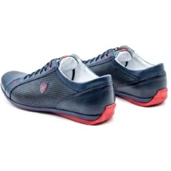Chaussures pour hommes en cuir naturel idéales pour un usage quotidien. Les chaussures bleu marine ont une tige lisse et le seul accent est les lacets et les ouvertures en relief sur les côtés. L’intérieur est également doublé de cuir naturel. La semelle est en matière synthétique rouge de haute qualité.