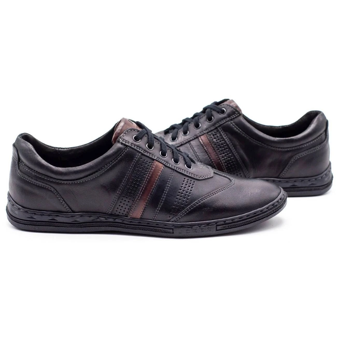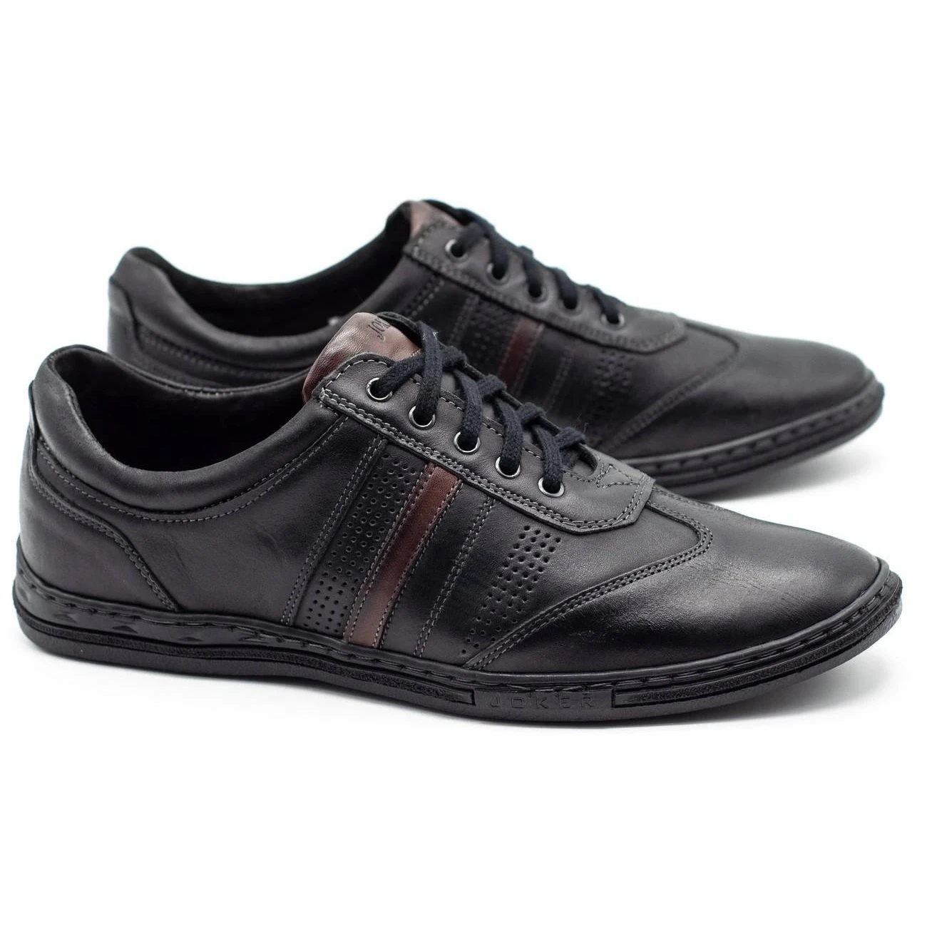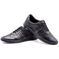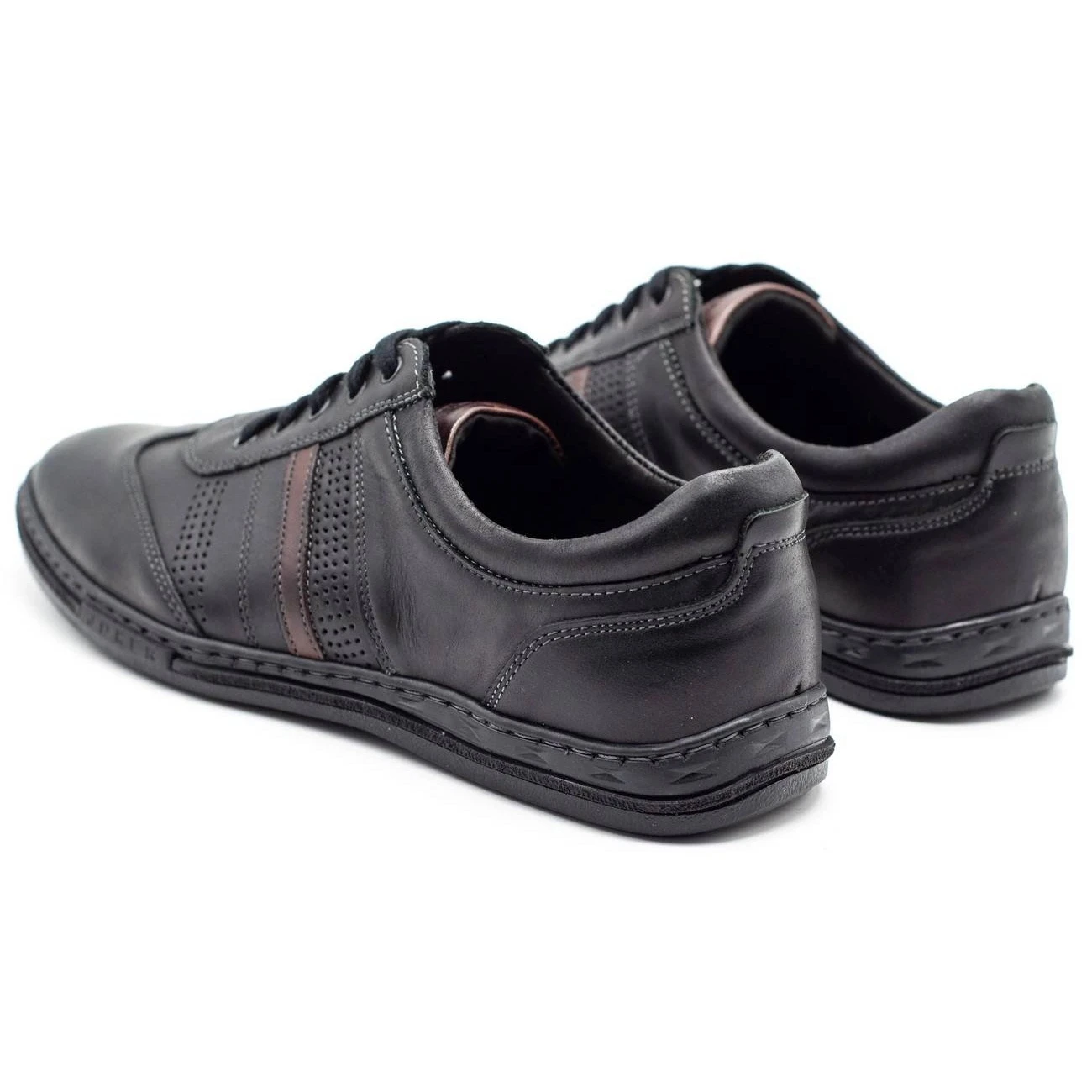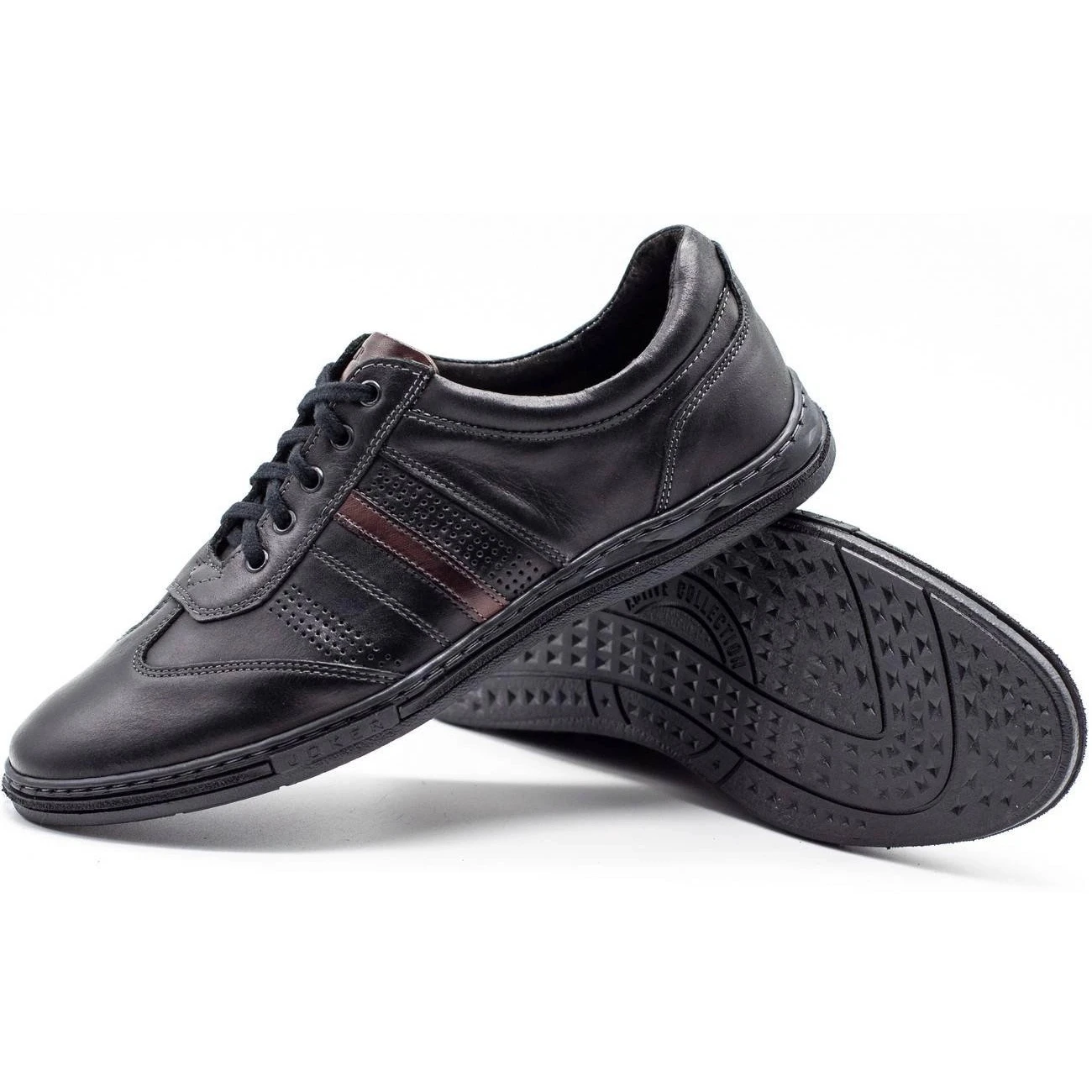 Des chaussures pour hommes décontractées et classiques pour toutes les occasions. La tige est en cuir naturel de haute qualité. Les bottines à lacets sont noires et ont des empiècements marron sur le côté et la languette. La plateforme de 2 cm a une semelle plate avec une bande de roulement prononcée. L’intérieur est doublé de cuir souple et confortable.