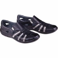 Chaussures décontractées pour hommes pour les journées plus chaudes. Les chaussures sont faites de cuir naturel noir confortable et de haute qualité. Les chaussures à enfiler ont des cales en caoutchouc sur le poignet, ainsi que de grandes ouvertures décoratives sur toute la surface. Les chaussures sont sur une plate-forme de 2 cm en matière synthétique avec une bande de roulement en bas.