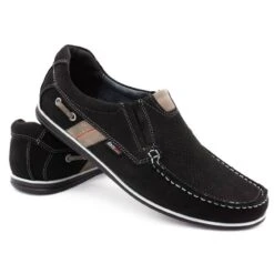 Mocassins classiques pour hommes en cuir véritable noir pour toutes les occasions. Les chaussures sont à enfiler et ont de délicats coins en caoutchouc sur les poignets. Sur le côté, la chaussure est décorée d’un lacet brillant et d’un insert. Il y a des surpiqûres légères sur toute la surface de la tige, et un motif ajouré sur le devant.