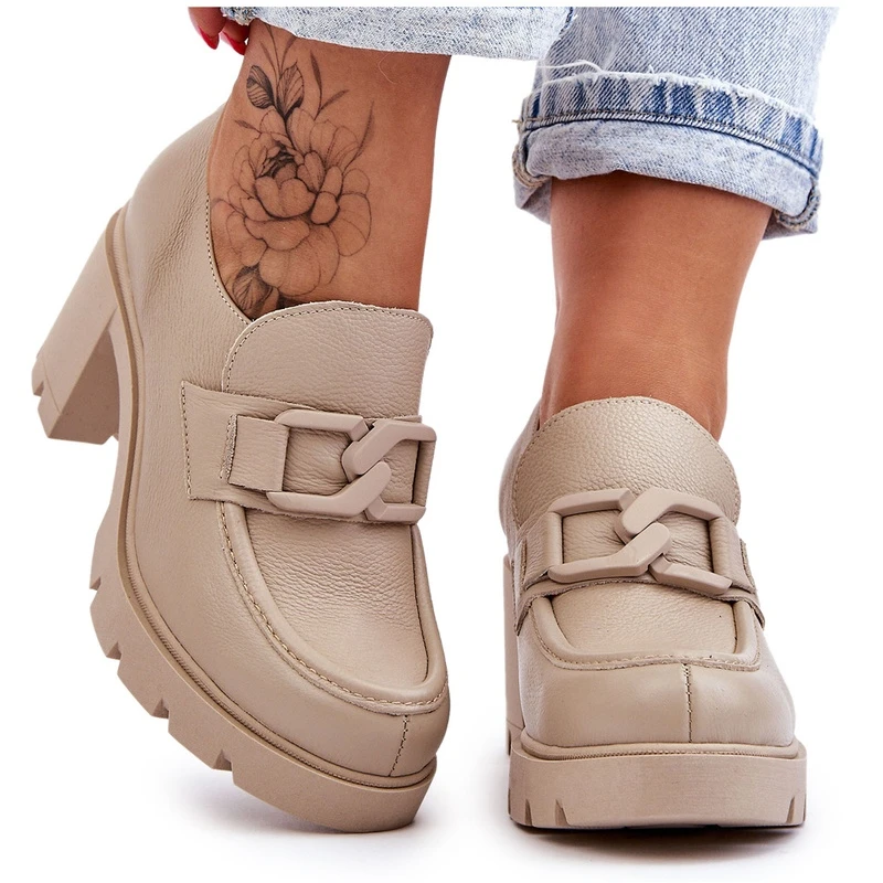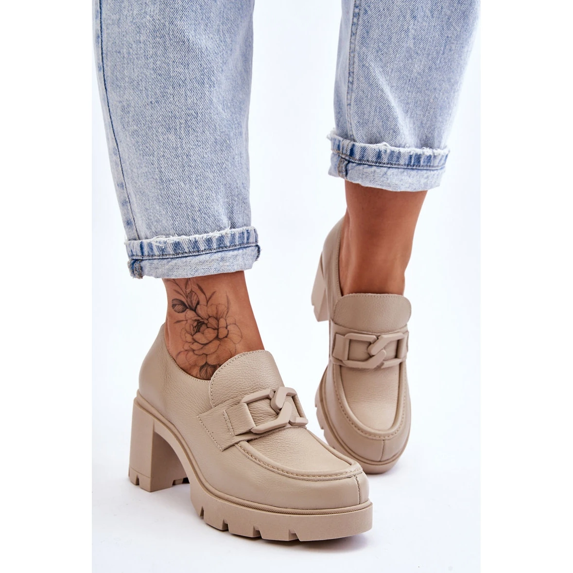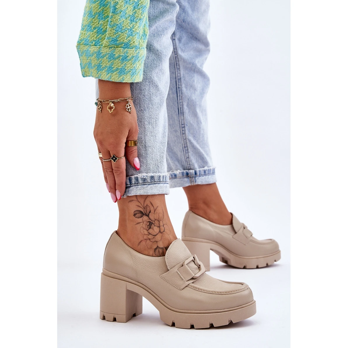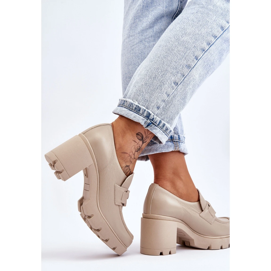 Magnifiques chaussures à talons hauts avec une tige en cuir naturel. L’intérieur est recouvert de cuir naturel et de matière textile, ce qui les rend très confortables à utiliser. La semelle intérieure est en cuir naturel et la semelle en caoutchouc. Un talon élégant en forme de tige large assurera la stabilité à chaque pas. Ornement miroir sur le devant. Le contrefort de talon est rigidifié. De plus, il y a une bande élastique sous la languette, ce qui rendra la chaussure parfaitement ajustée au pied. Lorsque vous choisissez une taille, veuillez utiliser le tableau des tailles.