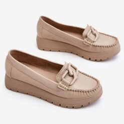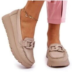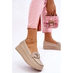 Les mocassins pour femmes sont fabriqués en cuir naturel avec une attention aux détails. Ils ont une décoration sur le devant. Le contrefort de talon de ces chaussures a été renforcé, ce qui permettra une bonne stabilisation du pied. Les mocassins sont fixés sur un coin et une plate-forme délicats. Vérifiez également les autres modèles disponibles sur notre site Web! Lorsque vous choisissez une taille, veuillez utiliser le tableau des tailles.