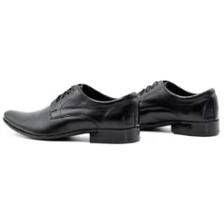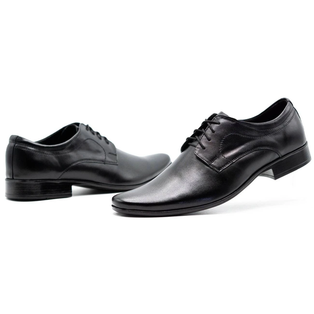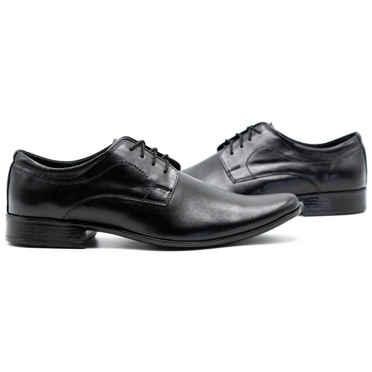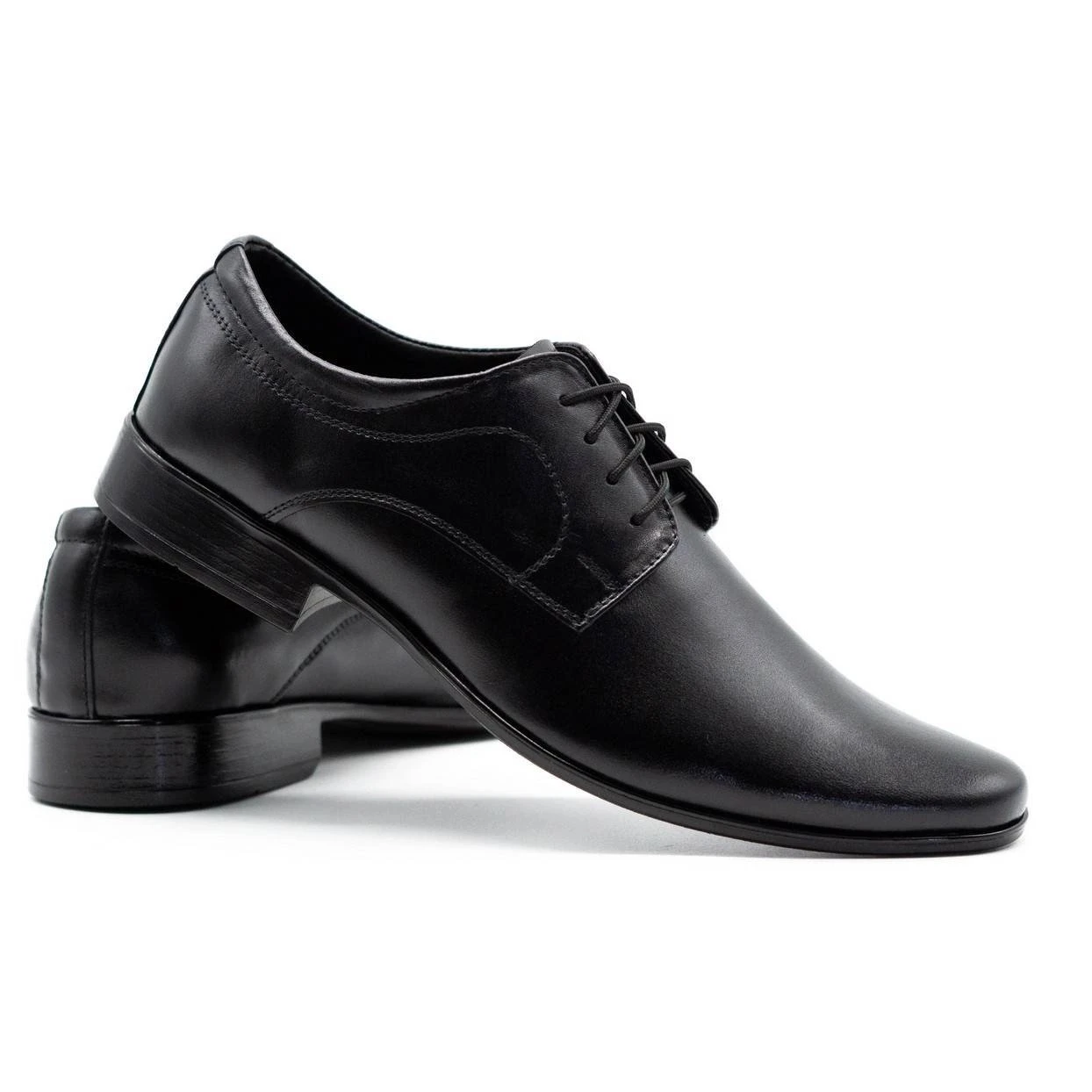 Chaussures habillées élégantes pour hommes en cuir écologique noir. Les chaussures sont fermées avec des lacets, qui sont placés dans les boucles sur le poignet du pied. La tige est lisse, sans aucun élément décoratif. Les plaquettes de nez sont très arrondies à l’avant. La semelle synthétique a un talon plat de 2,5 cm et une bande de roulement délicate.