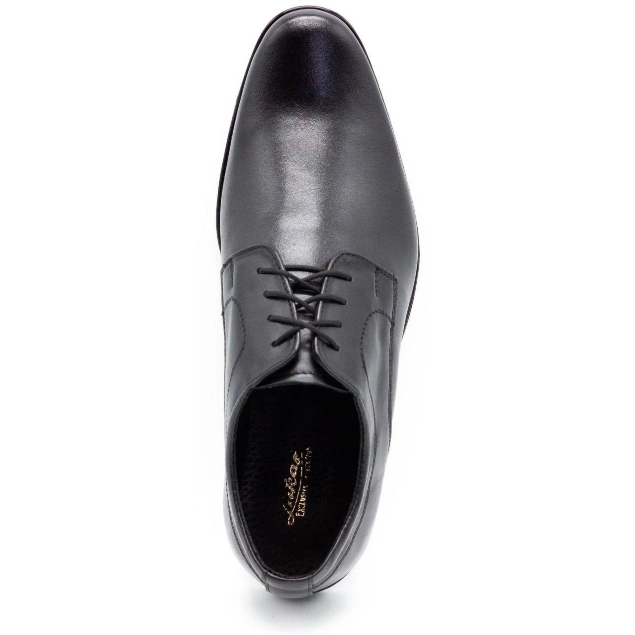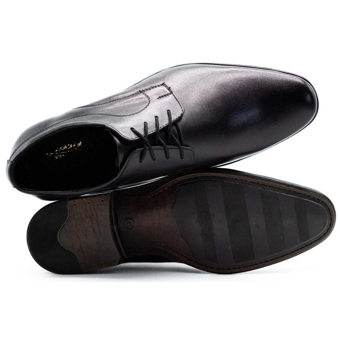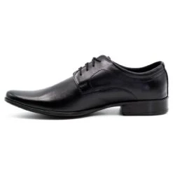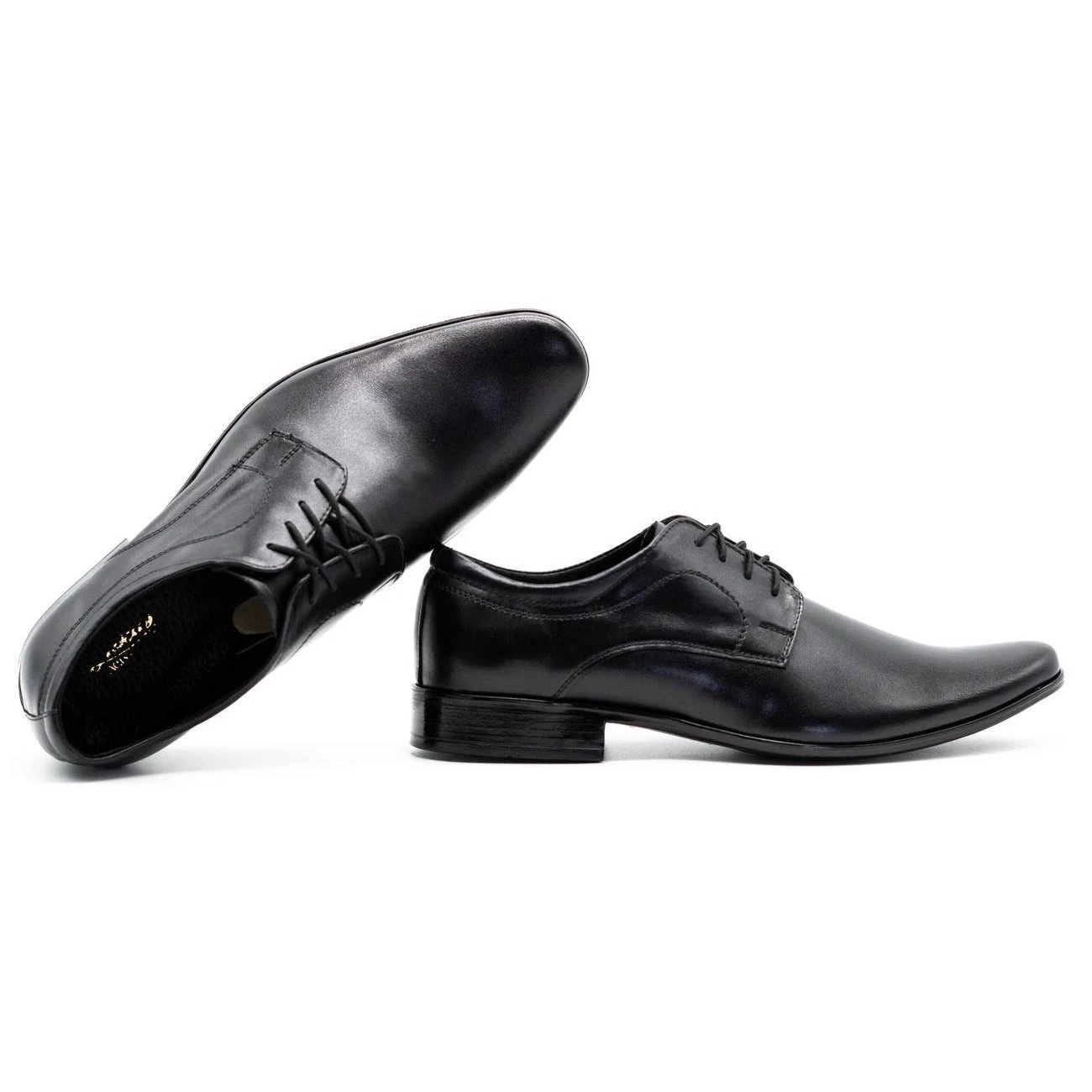 Chaussures habillées élégantes pour hommes en cuir écologique noir. Les chaussures sont fermées avec des lacets, qui sont placés dans les boucles sur le poignet du pied. La tige est lisse, sans aucun élément décoratif. Les plaquettes de nez sont très arrondies à l’avant. La semelle synthétique a un talon plat de 2,5 cm et une bande de roulement délicate.