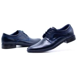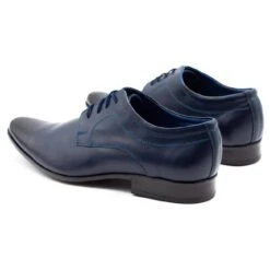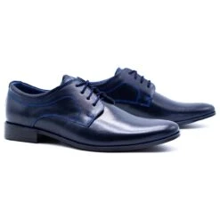Des chaussures élégantes pour hommes pour toutes les occasions. Les chaussures bleu marine sont faites de cuir naturel de haute qualité. À l’avant, les orteils sont fortement arrondis et à l’arrière, il y a un contrefort de talon raidi. Le laçage classique est situé sur la colonne vertébrale au niveau du poignet. La partie inférieure est une semelle en plastique.