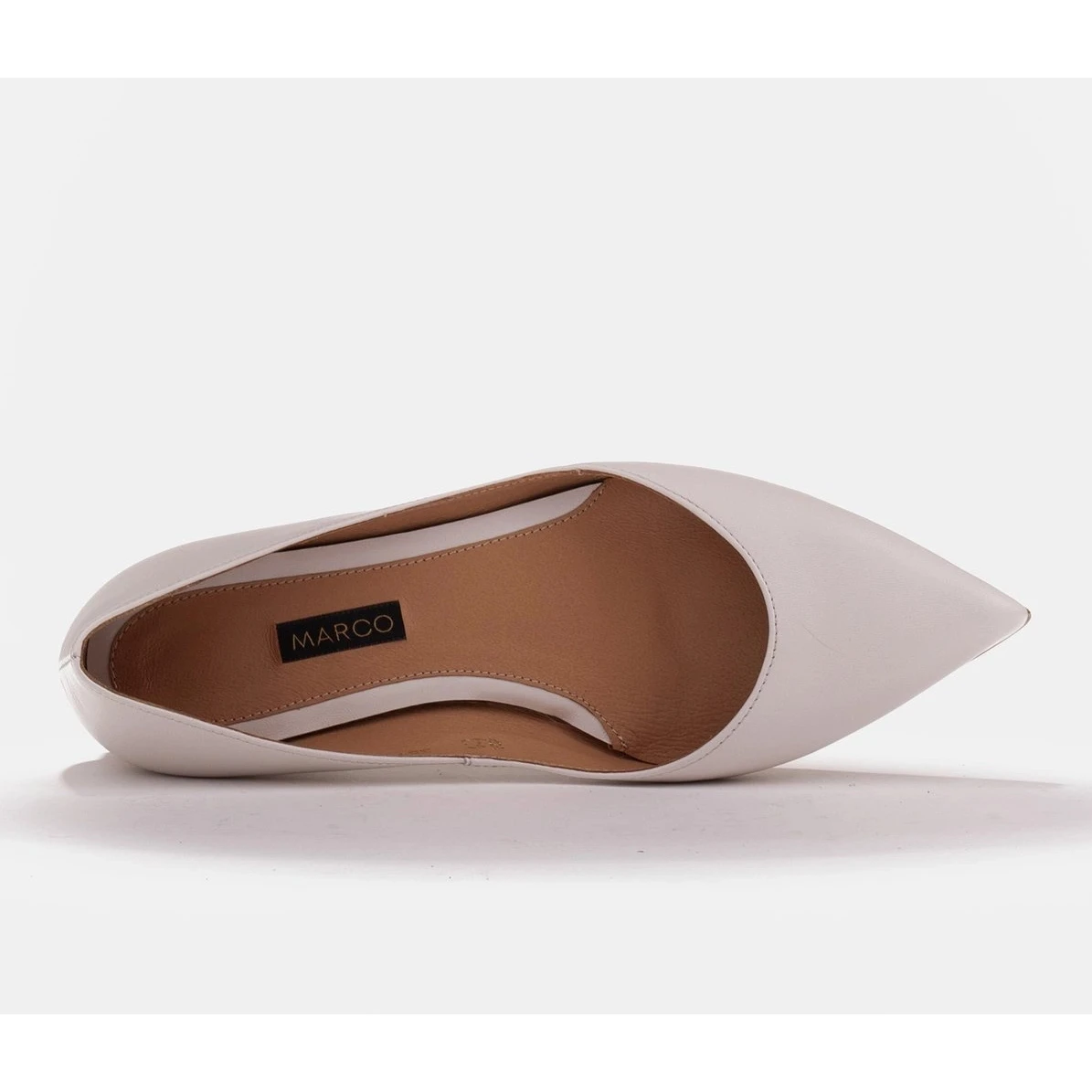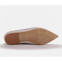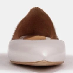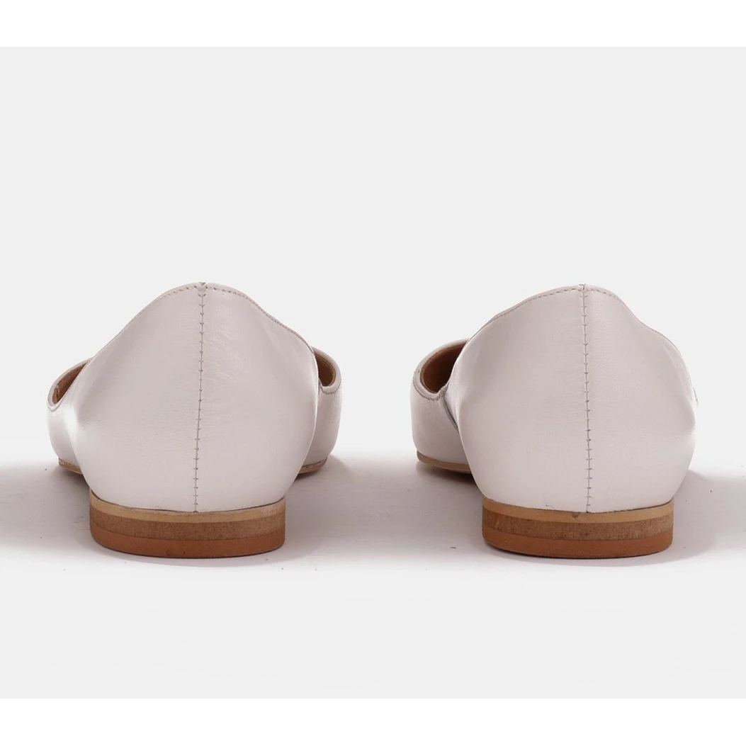 Ballerines en cuir fleur blanc perle. La tige est très profilée avec des côtés bas. La semelle est faite d’un matériau de type micro doux et léger.