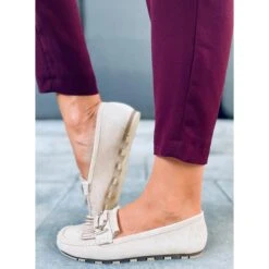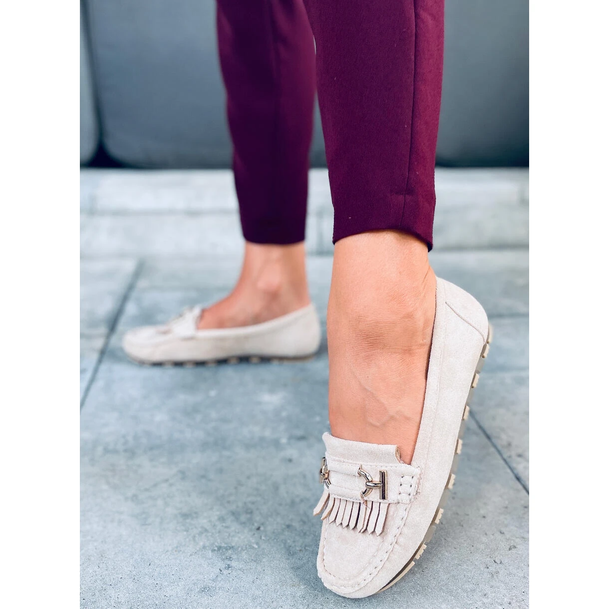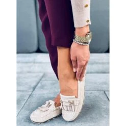 Mocassins classiques pour femmes. Si vous appréciez le style, choisissez ce modèle intemporel avec une finition en daim. Un ornement subtil avec des franges est leur signe caractéristique. Une semelle intérieure en cuir souple et naturel vous permettra de vous sentir à l’aise tout au long de la journée. Matériau extérieur – daim écologique.