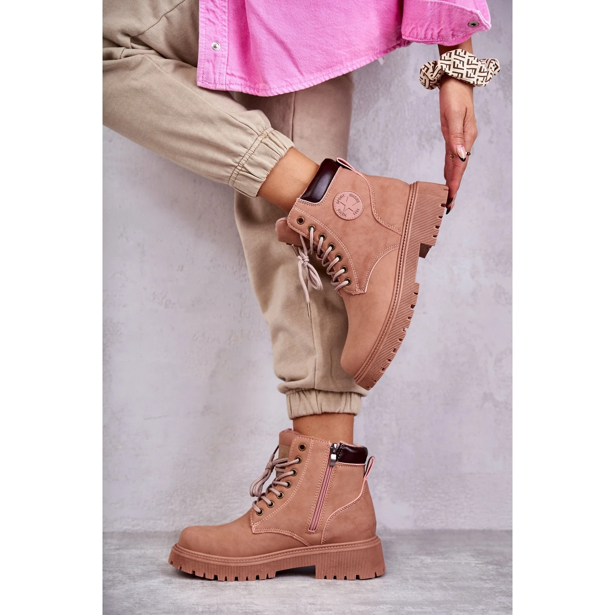 Les bottes de style trappeur sont parfaites pour les journées plus froides! Ils ont été fabriqués en cuir écologique. Ils ont un laçage classique et une fermeture éclair sur le côté de la tige. Modèle avec contrefort de talon renforcé supplémentaire. Intérieur isolé avec une couverture agréable au toucher. Les trappeurs sont montés sur une plate-forme délicate et un talon plat.