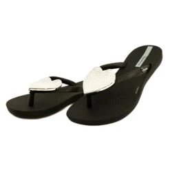 Un autre produit que nous avons à vous proposer sont des tongs noires à la mode avec un cœur argenté. Les chaussures ont un look phénoménal et, comme dans le cas de ce type de chaussures, elles sont incroyablement légères. Les tongs sont particulièrement utiles en été, lorsque nous recherchons pratiquement tous de tels modèles. Les chaussures sont faites de matériaux très résistants, visibles à l’œil nu. Après les avoir posés sur le pied, on ne sent presque plus leur poids, ce qui est extrêmement confortable lors de l’utilisation de ce modèle.