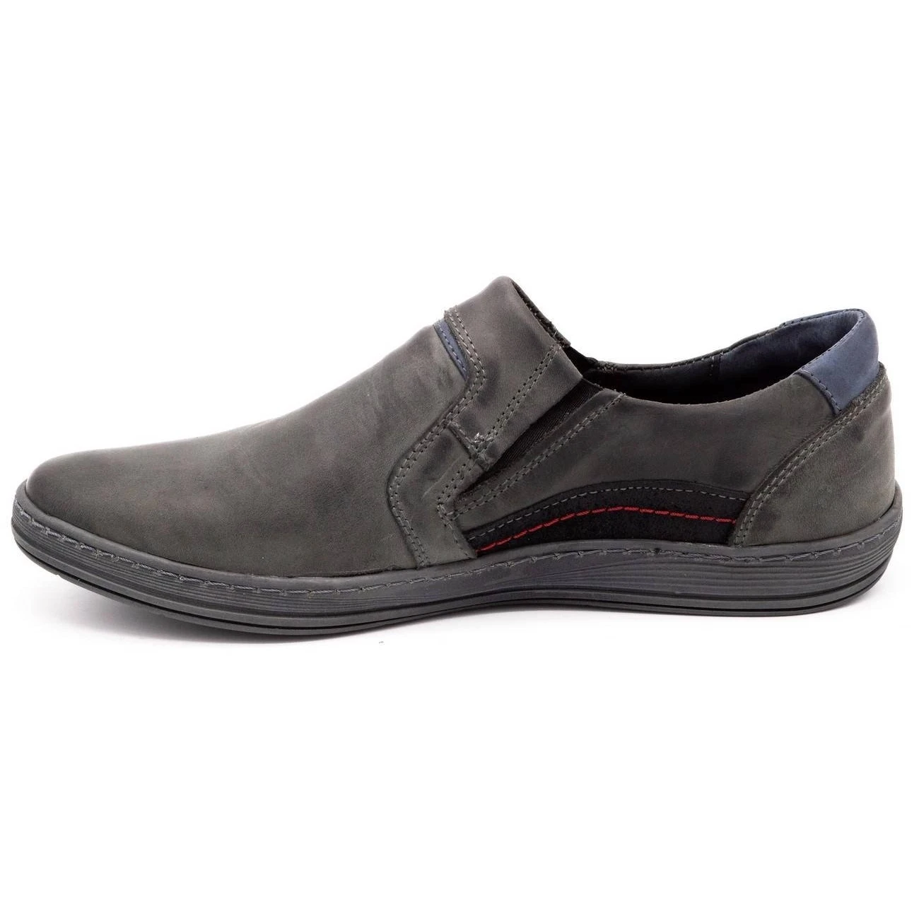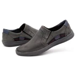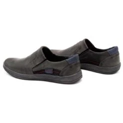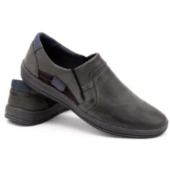 Des mocassins décontractés pour hommes tous les jours, mais ils iront aussi bien dans un style élégant. Les chaussures grises sont en cuir naturel de haute qualité. La tige a un talon intégré et renforcé avec une couche de plastique, et sur les côtés des inserts en bleu marine et noir. Les chaussures à enfiler ont des coins élastiques au poignet.