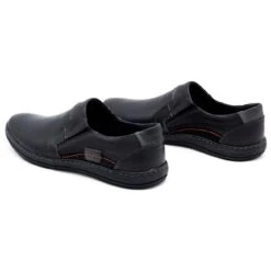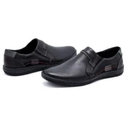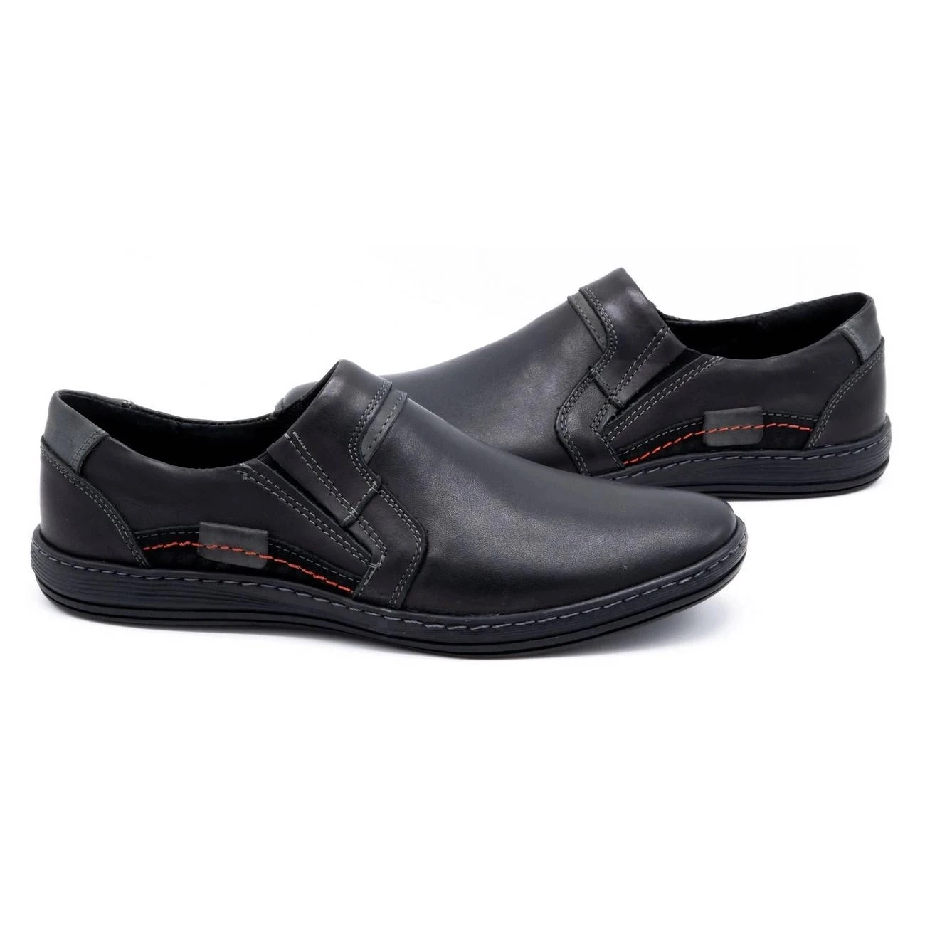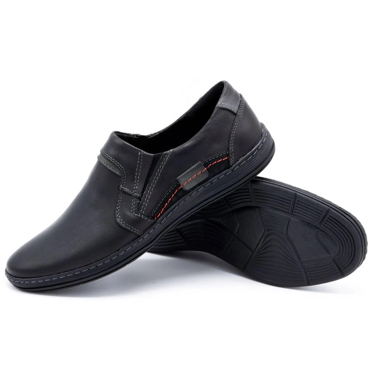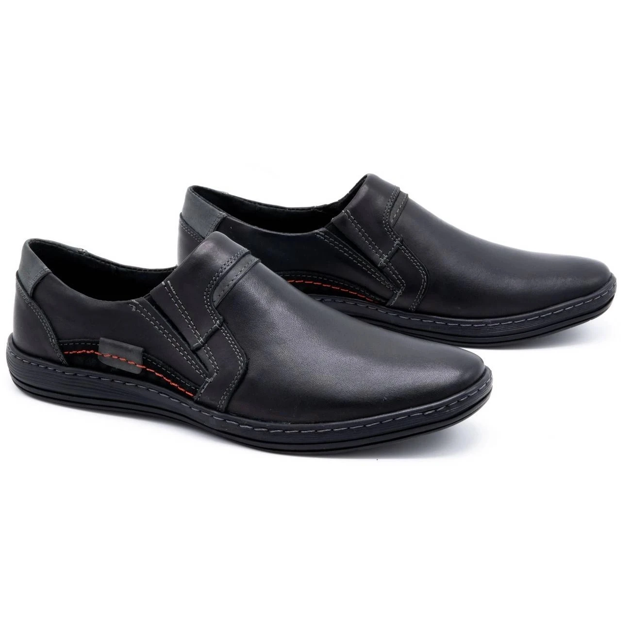Chaussures pour hommes pour un usage quotidien et pour diverses cĂ©lĂ©brations. Les chaussures Ă©lĂ©gantes en cuir naturel sont noires et se glissent sur le pied. On retrouve des petites cales en caoutchouc au poignet, et un insert en imitation daim sous la cheville, renforcĂ© d’une surpiqĂ»re rouge. Les mocassins ont une plateforme plate avec une semelle synthĂ©tique.
