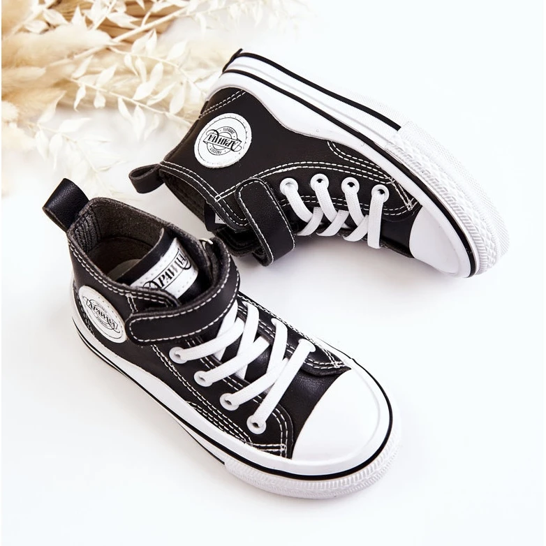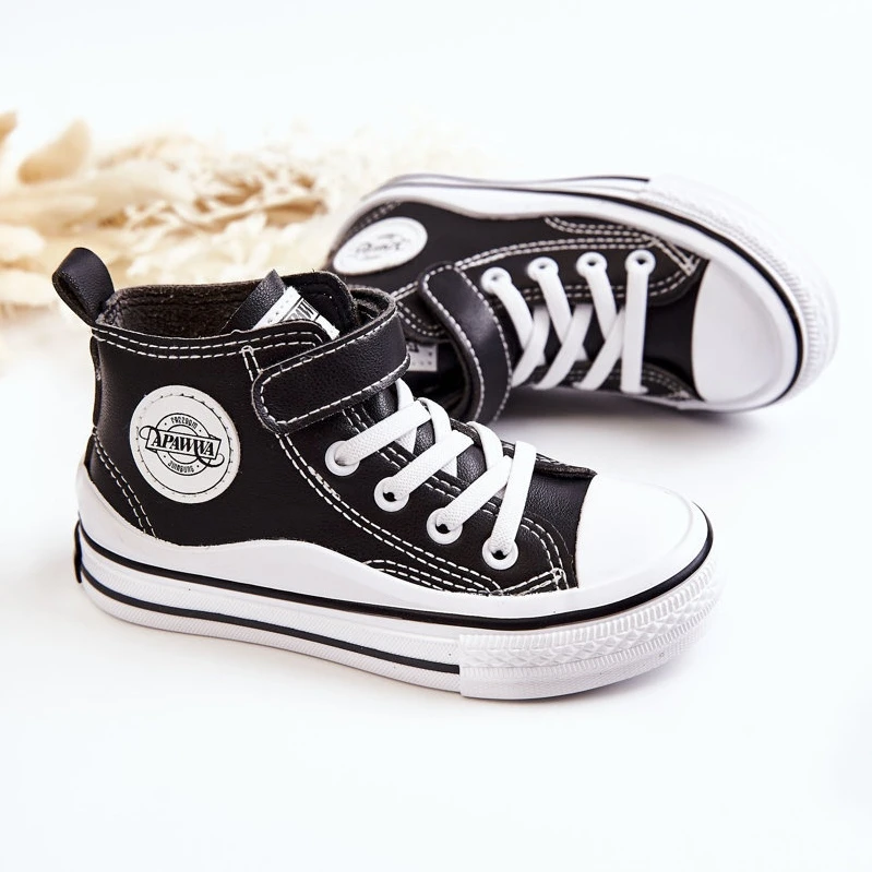 Baskets classiques pour enfants en cuir écologique de haute qualité. Haut de la cheville avec un badge cousu sur le côté. Les baskets ont des velcros et des élastiques imitant les lacets. La pointe est renforcée avec un matériau en caoutchouc. Chaussures montées sur une plate-forme souple en caoutchouc. La semelle est en plus antidérapante. La semelle intérieure en cuir naturel offrira un confort à l’enfant lors de l’utilisation de la chaussure. Ce modèle devrait être dans la garde-robe de votre enfant ! Lorsque vous choisissez une taille, veuillez utiliser le tableau des tailles.