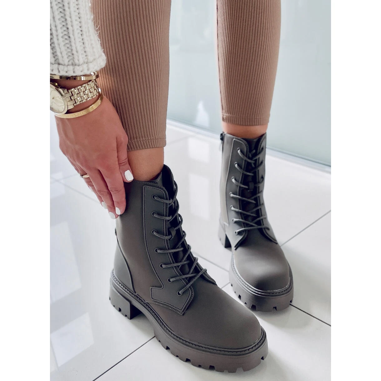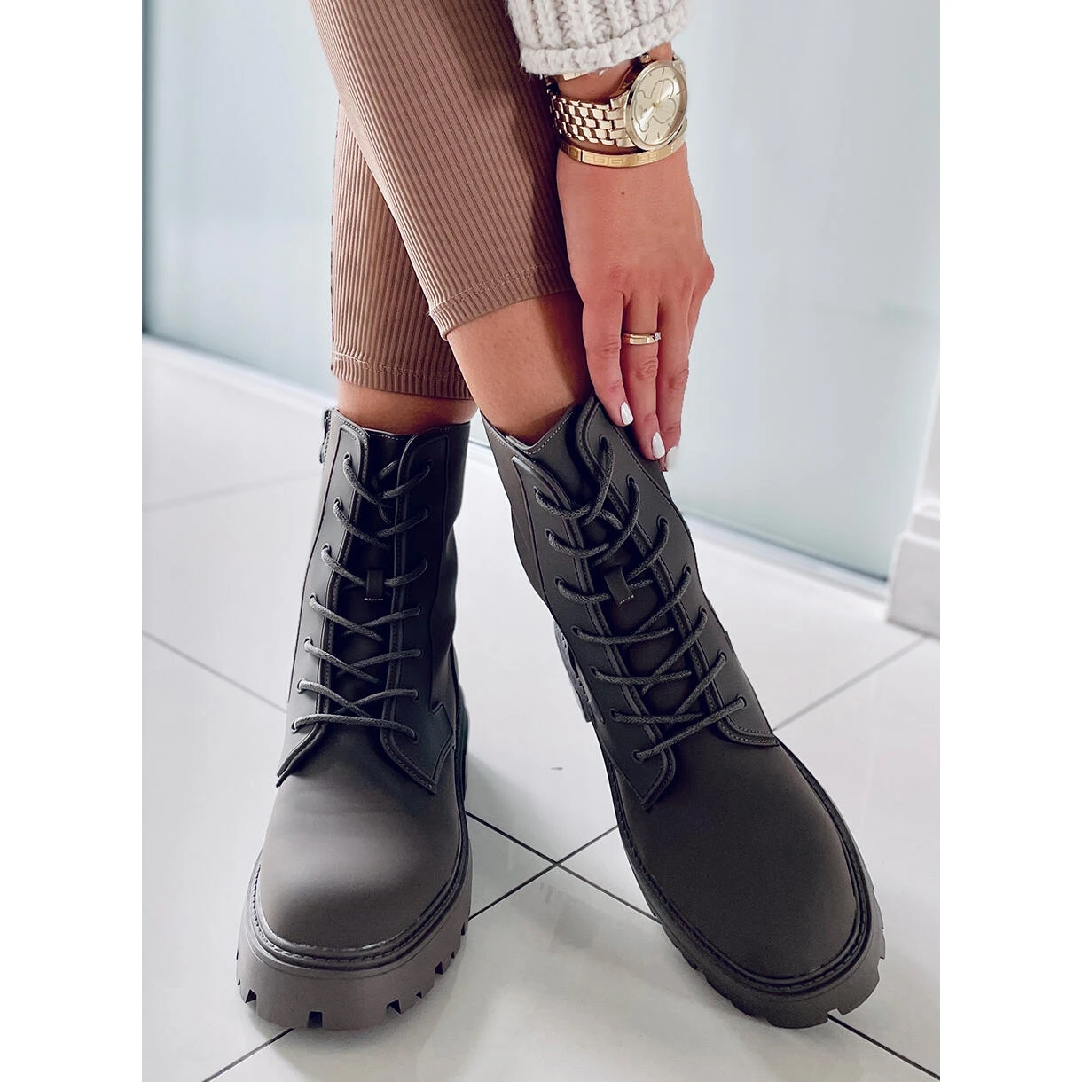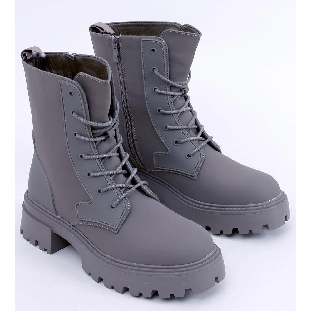 Bottes à lacets pour femmes – ouvrières. La semelle haute sur le protecteur assure un confort à chaque pas – voyez par vous-même 🙂 Laçage classique, de sorte qu’ils peuvent être parfaitement ajustés à la taille du pied, mais ont également une fermeture à glissière sur le côté de la tige. Ils sont fabriqués en cuir écologique dans une finition mate efficace. Undersuit – fourrure délicate.