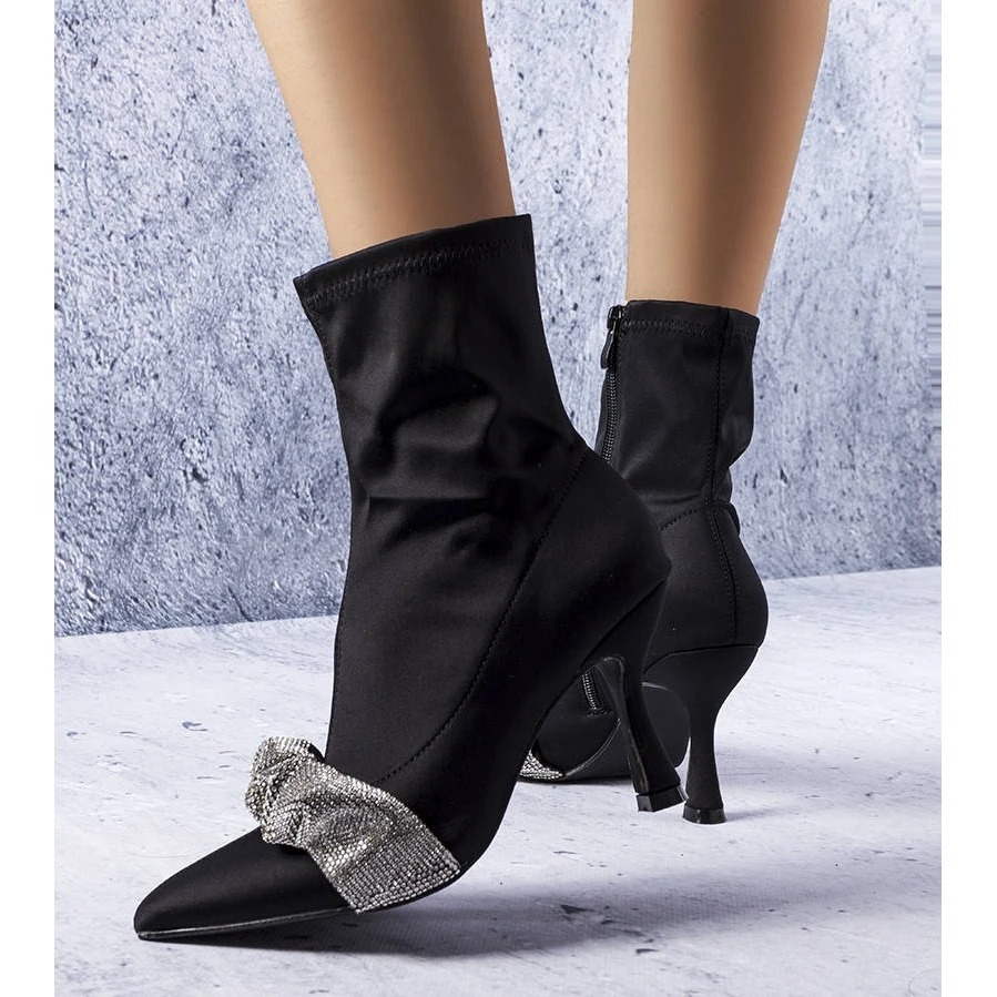 Bottines Caisse à talon aiguille. Tour de cheville sur mesure. Nez pointu. Modèle fermé par un zip à l’intérieur de la tige. Fabriqué en tissu élastique lisse, non isolé. Recommandé pour les personnes aux pieds étroits. Bottes de style vintage richement décorées de zircons qui distingueront tout style décontracté. Numérotation standard, veuillez vous référer à votre taille.
