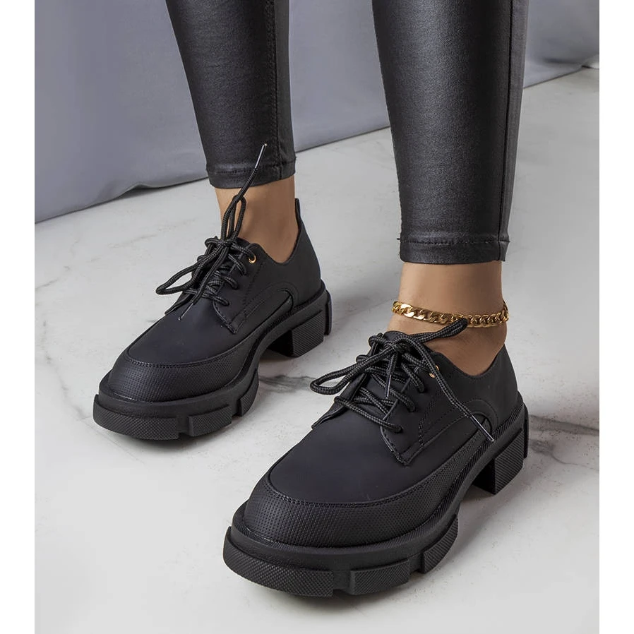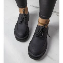 Chaussures Kay sur une semelle de tracteur à la mode avec un talon carré. Cambrion basse avant la cheville. Laçage court sur le devant. Bout rond et coutures minimalistes. Fabriqué en cuir écologique avec une semelle intérieure. À porter avec une blouse à chaînes décoratives et une jupe en cuir. Numérotation standard, veuillez suivre votre taille.